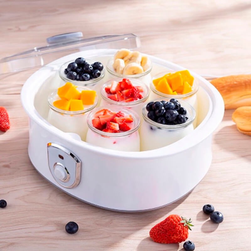 Замечательное устройство позволит приготовить множество рецептов вкусного и полезного йогурта. Натуральный йогурт, который вы приготовили собственноручно куда лучше и полезнее йогурта, который продается в магазинах, ведь они не содержат консервантов, различных вкусовых и ароматических добавок. Стильный современный дизайн корпуса йогуртницы, который изготовлен из нержавеющей стали, прекрасно гармонирует с интерьером вашей кухни. В комплекте 7 стеклянных чашек для йогурта с функцией установлениясрока годности на крышечках