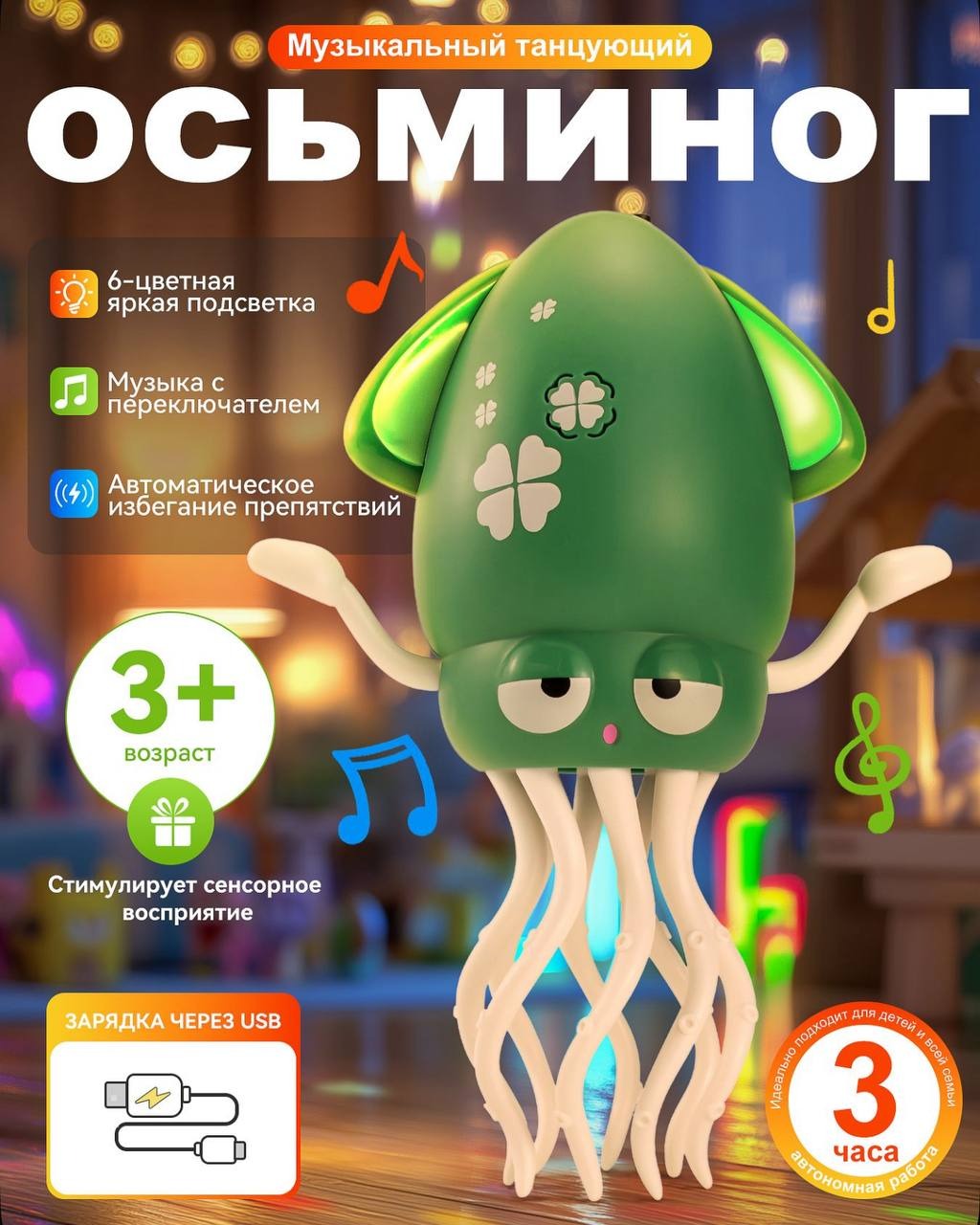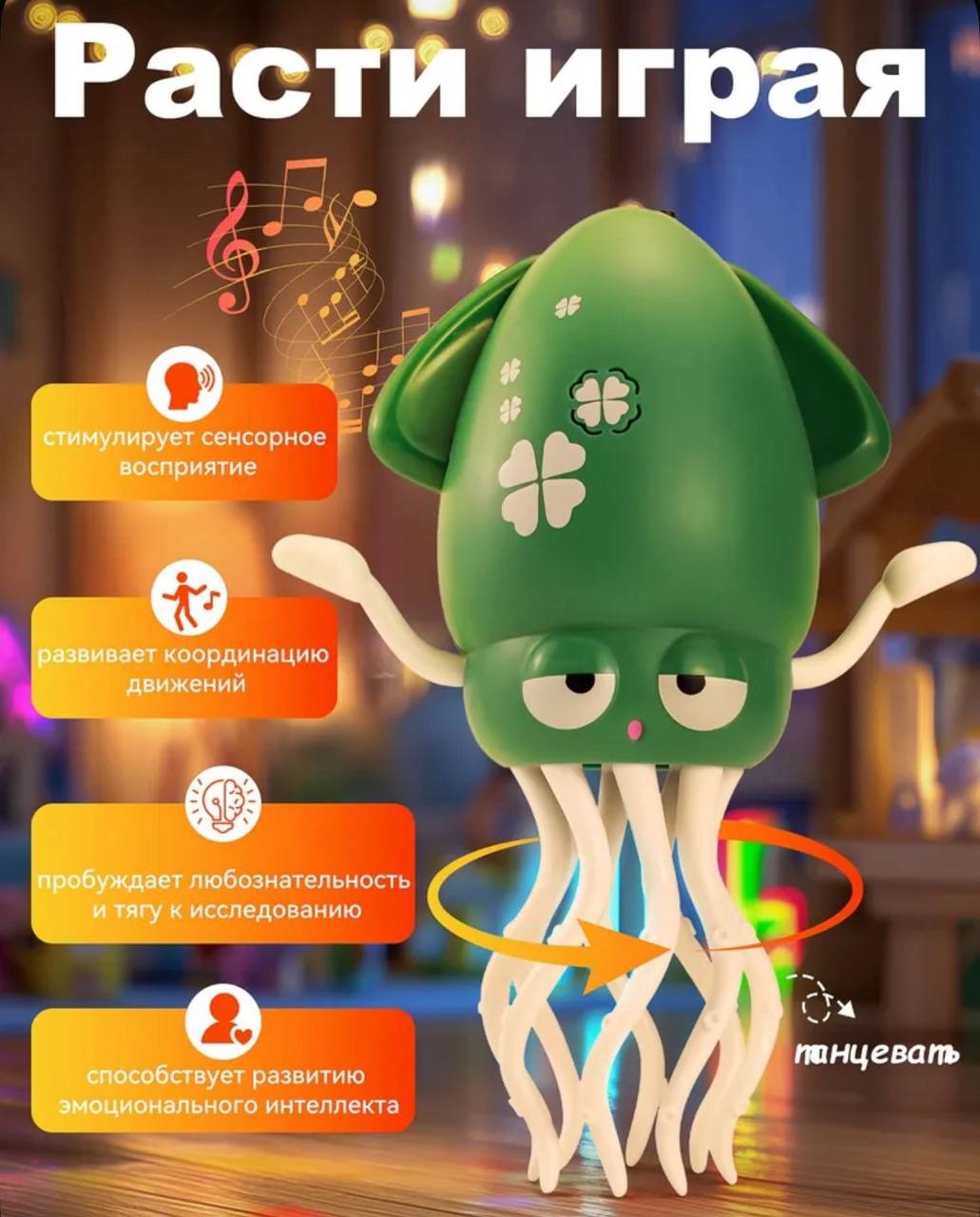 Игрушка «Музыкальный танцующий осьминог» — это не просто забава, а настоящий помощник в развитии ребёнка. Она объединяет в себе обучение, весёлые эмоции и безопасность, вызывая неподдельный восторг у малышей.