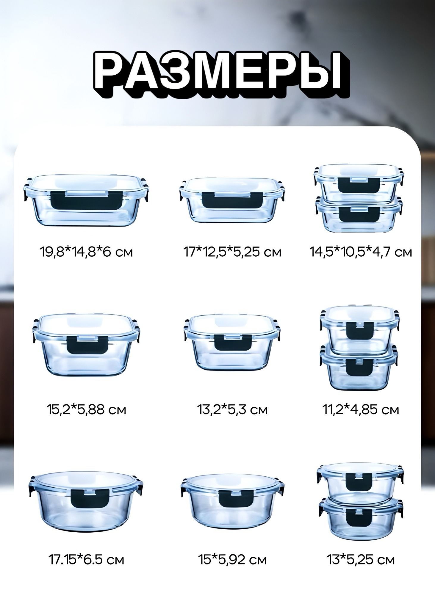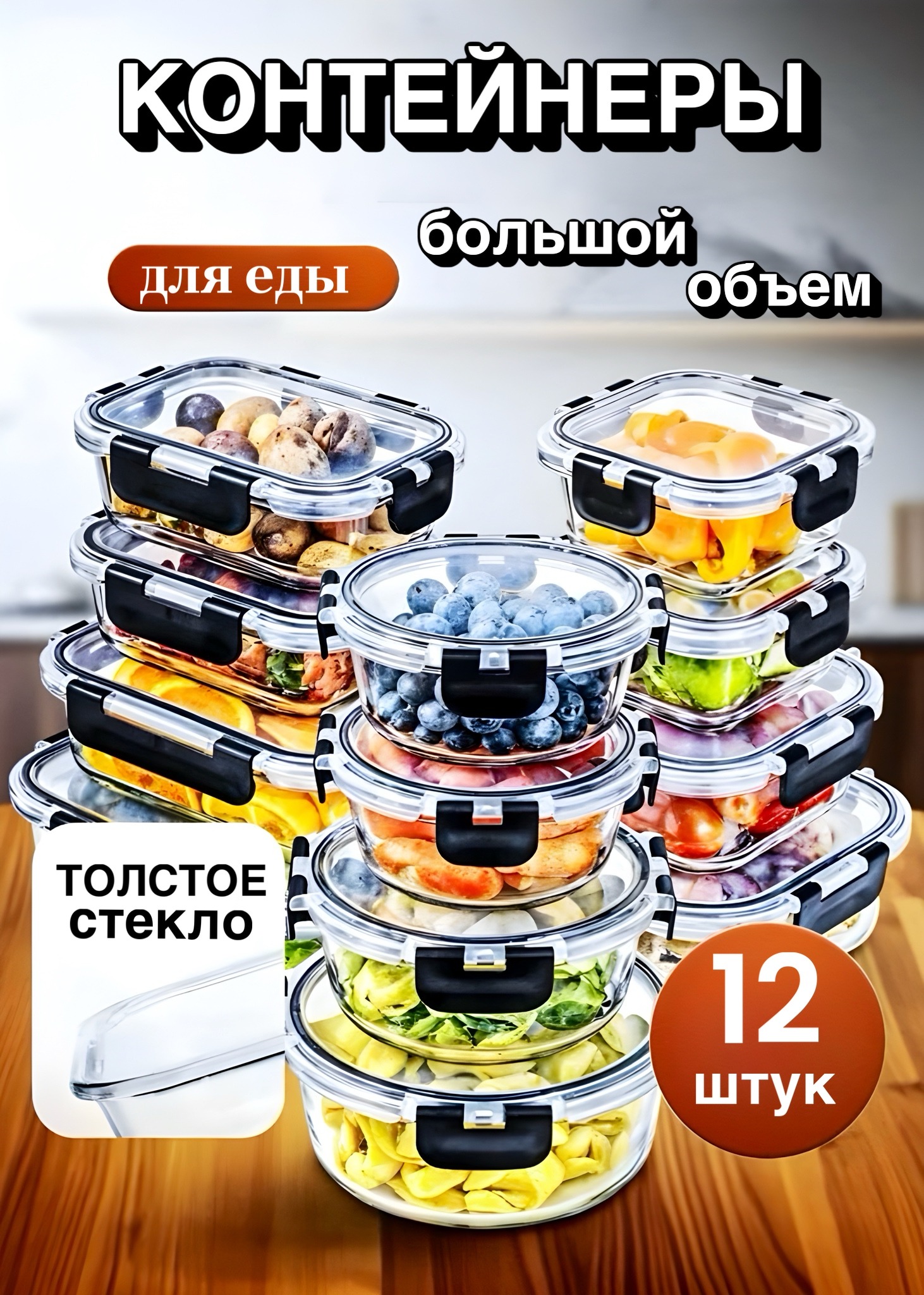 Набор стеклянных контейнеров для хранения продуктов, 12 шт (прямоугольные и круглые, с герметичными крышками)