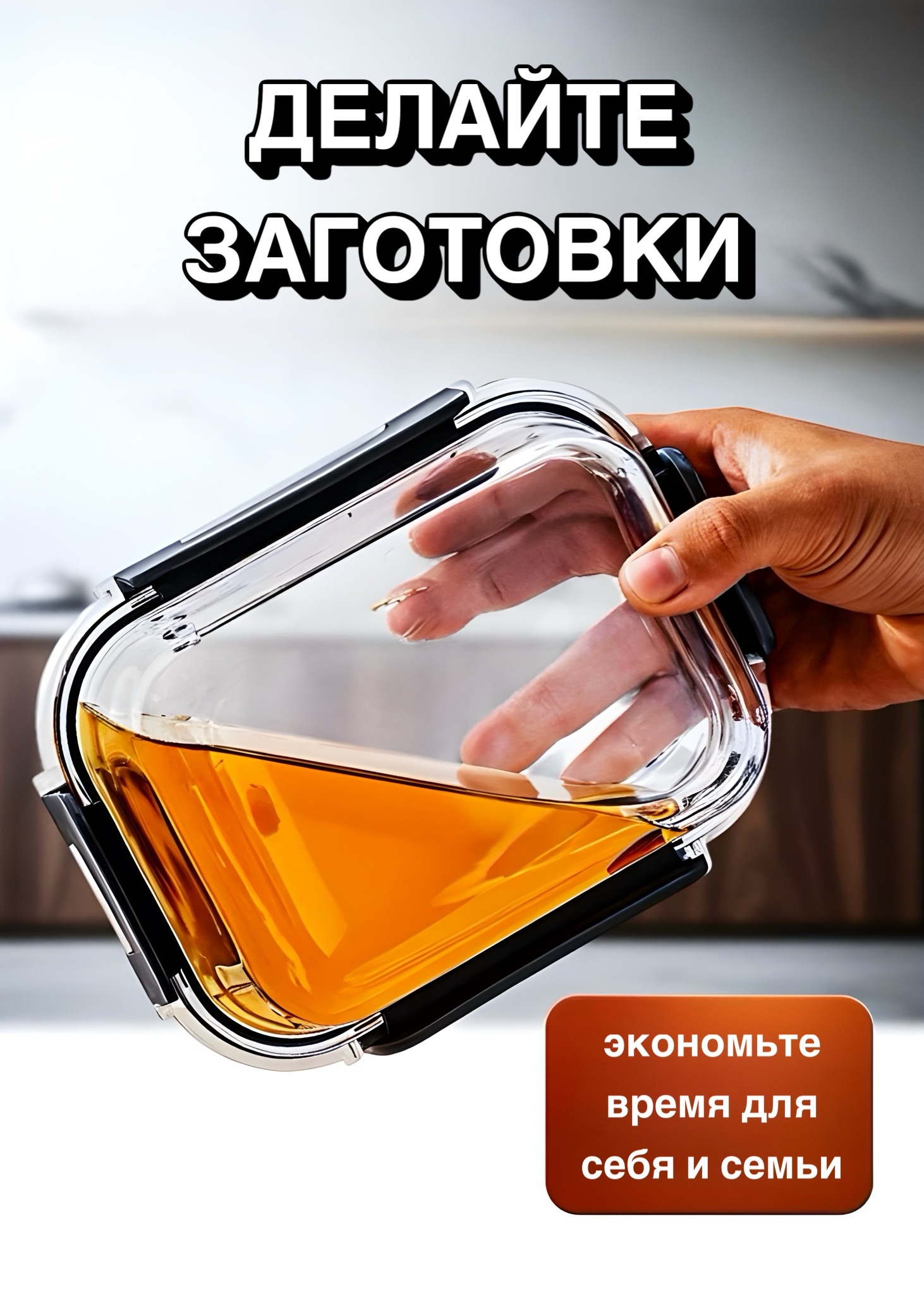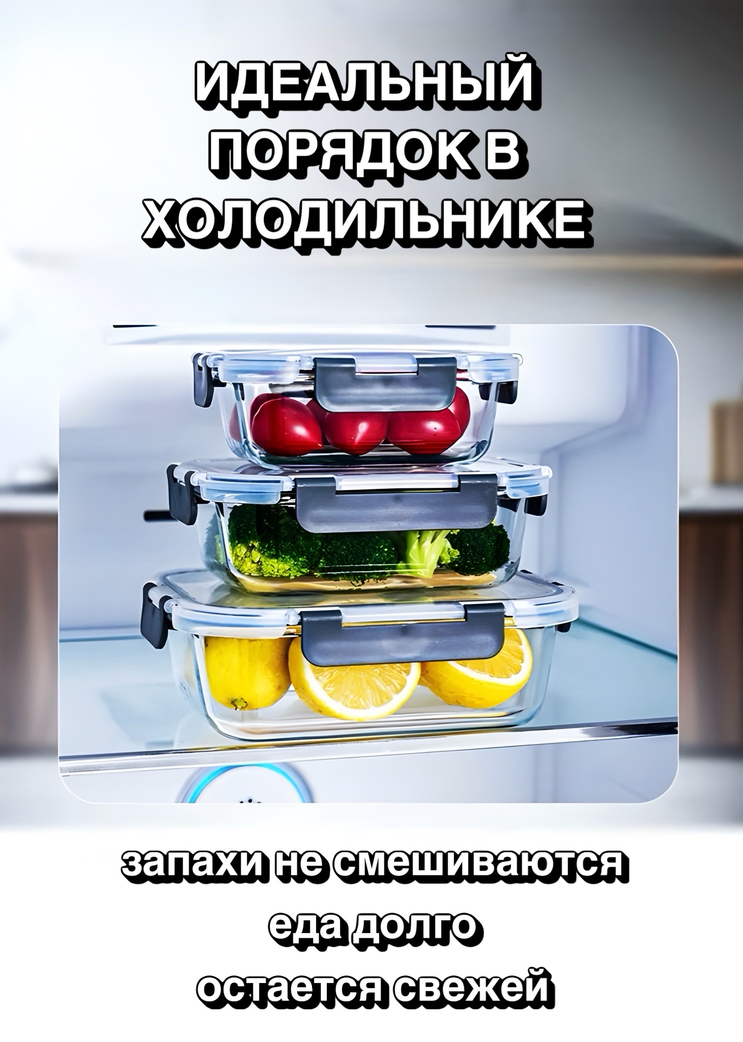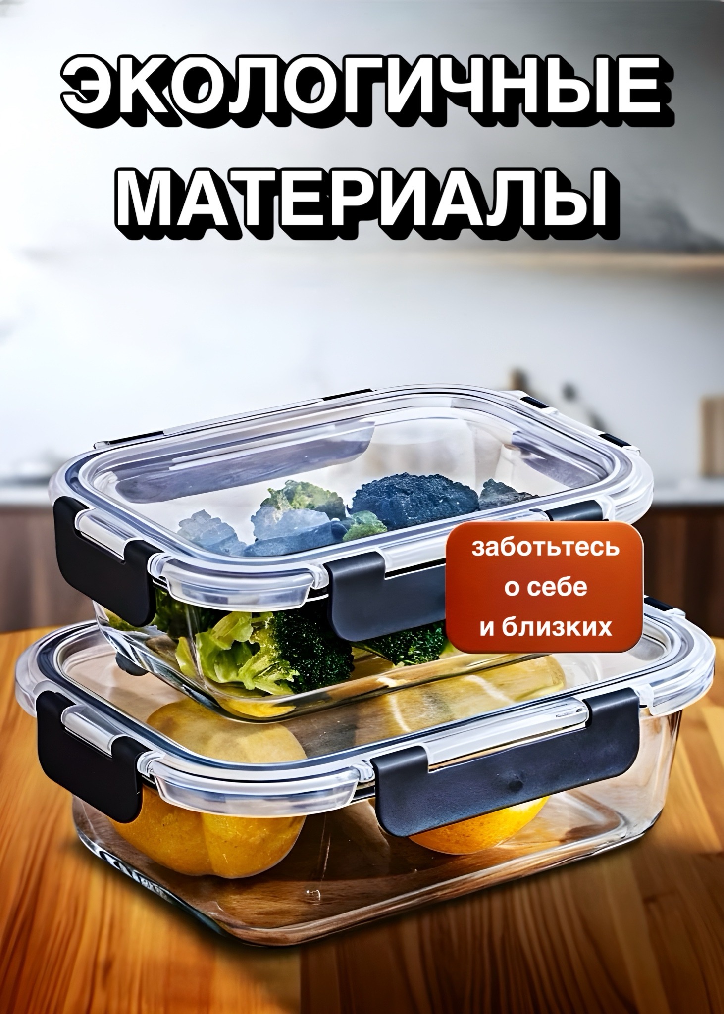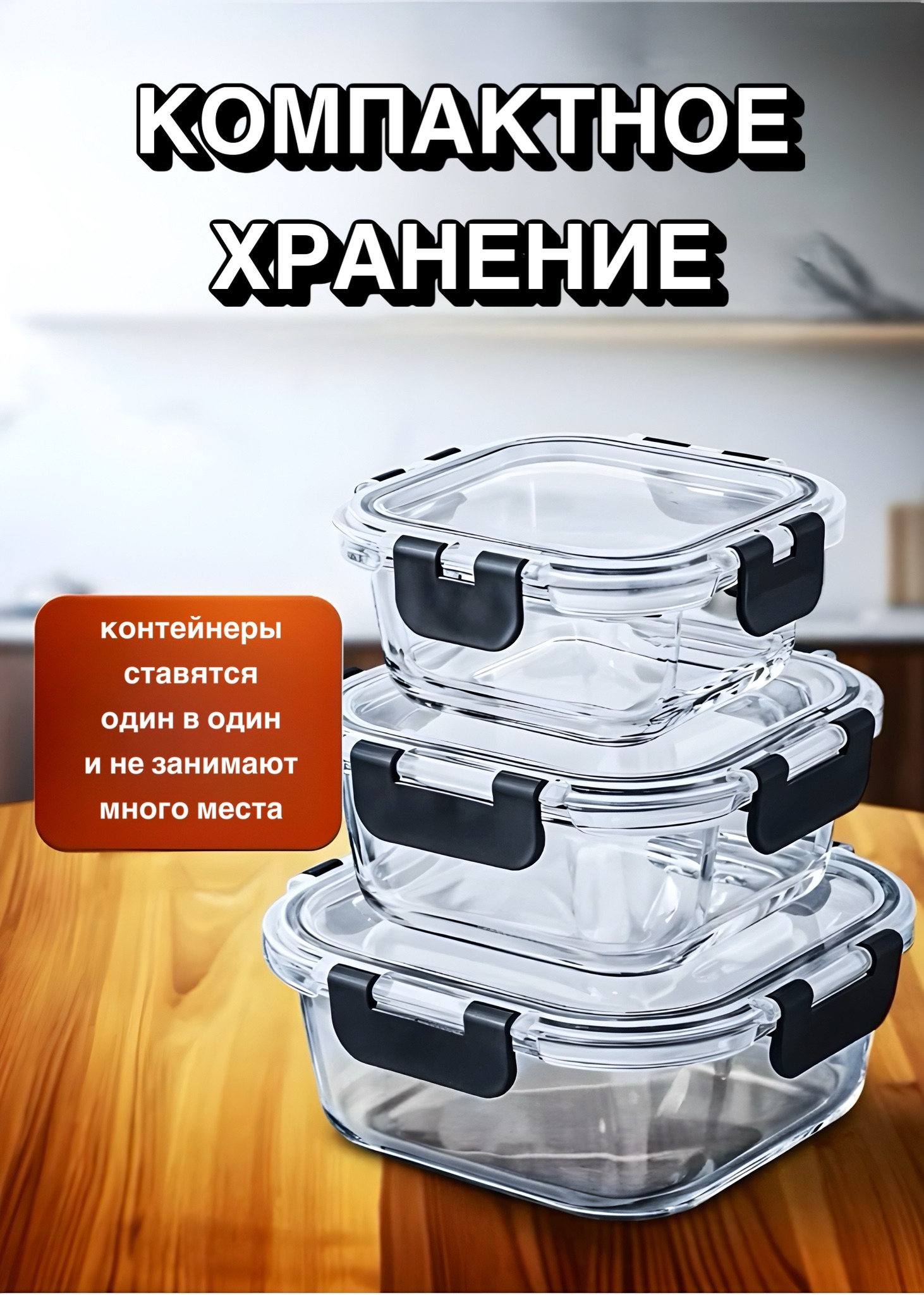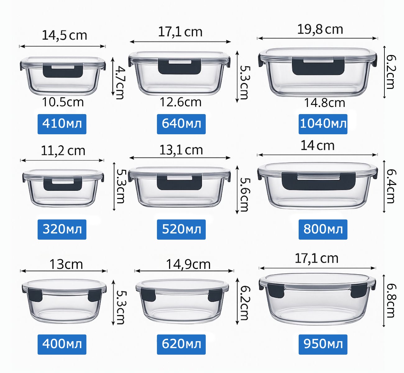 Благодаря разным размерам контейнеров, удобно хранить как небольшие порции, так и полноценные блюда. Прозрачное стекло позволяет видеть содержимое без открытия.