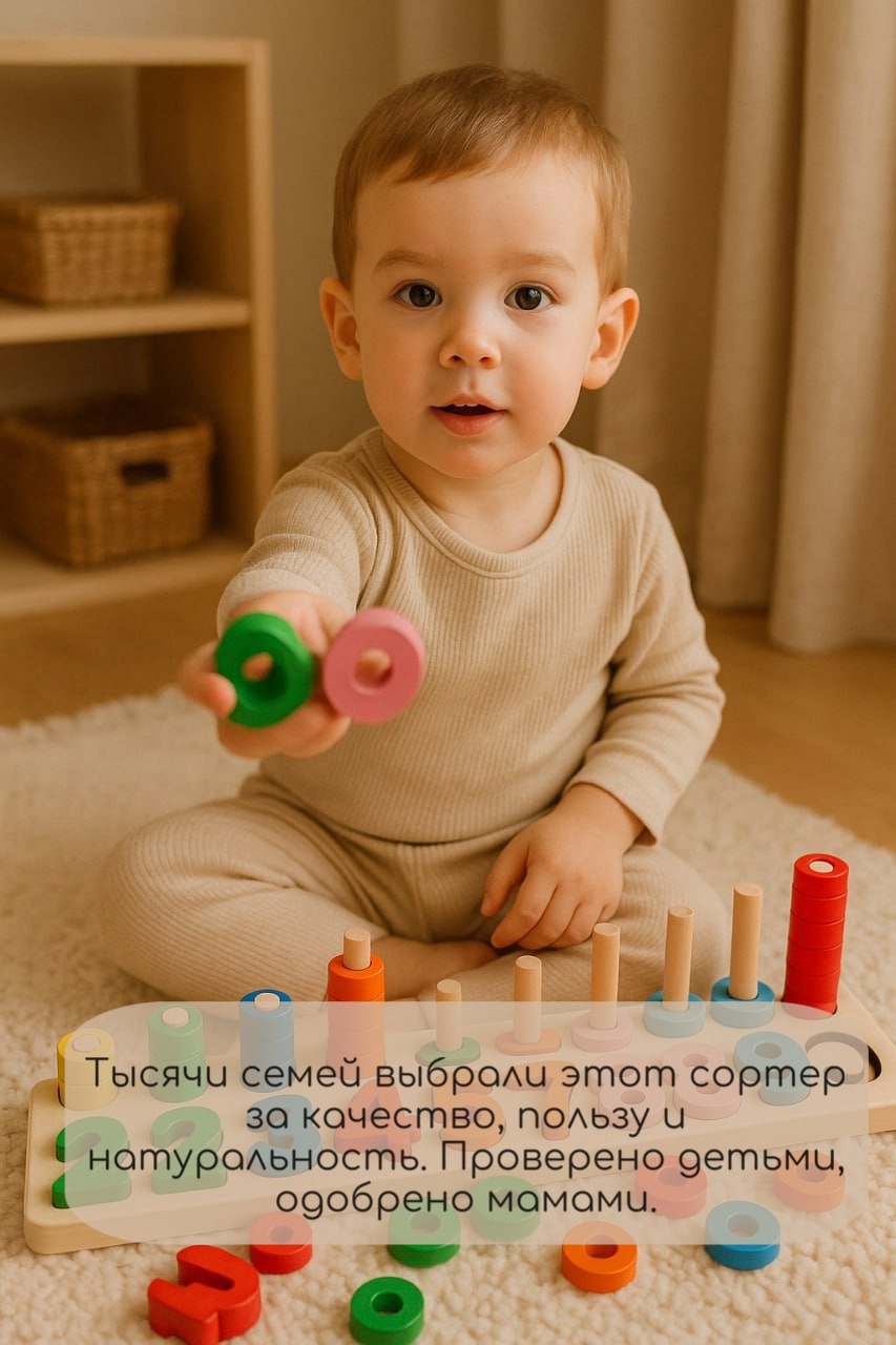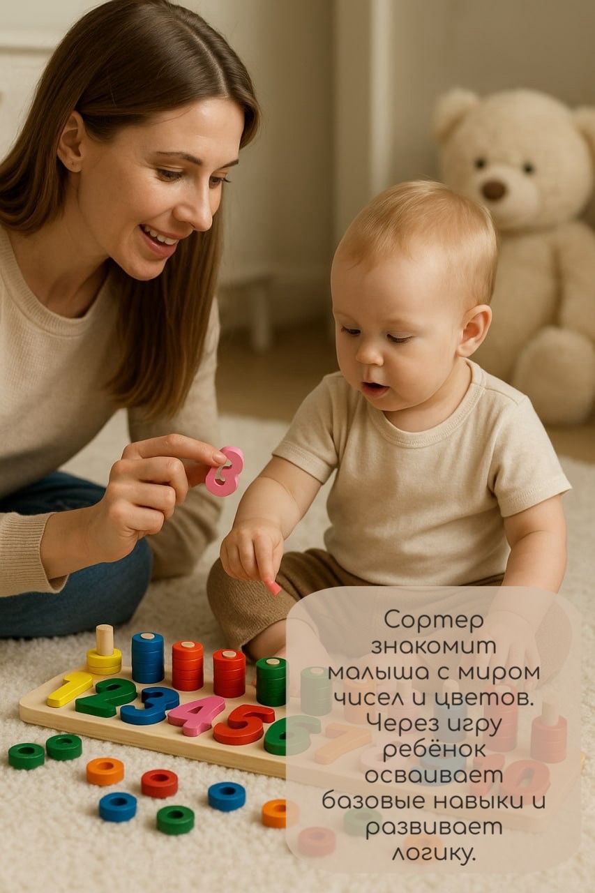 Деревянный развивающий сортер «Цифры и цвета» — идеальная игрушка для первых шагов в обучении.