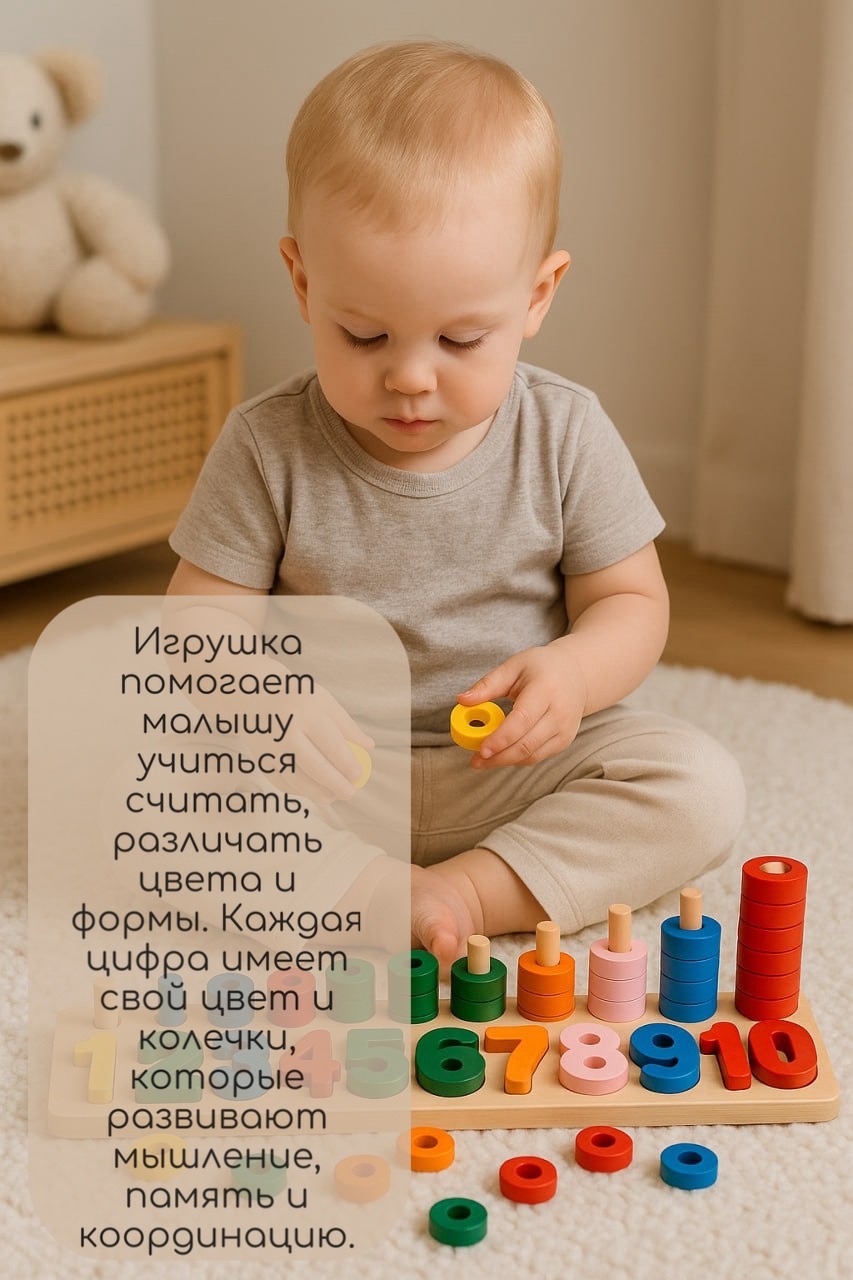 Каждая цифра имеет свой цвет и набор колец, что помогает ребёнку визуально запоминать последовательность и сопоставлять элементы.