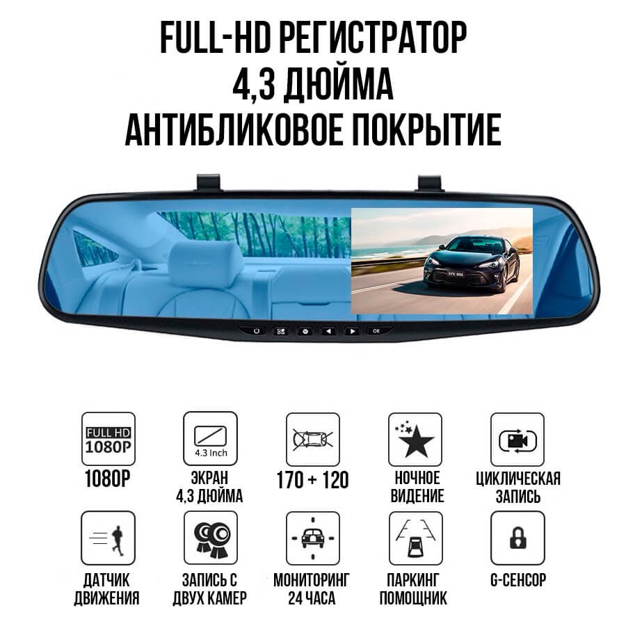 4,3 дюймовый ЖК-дисплей, с высоким качеством записи видео. Камера заднего вида для безопасной парковки