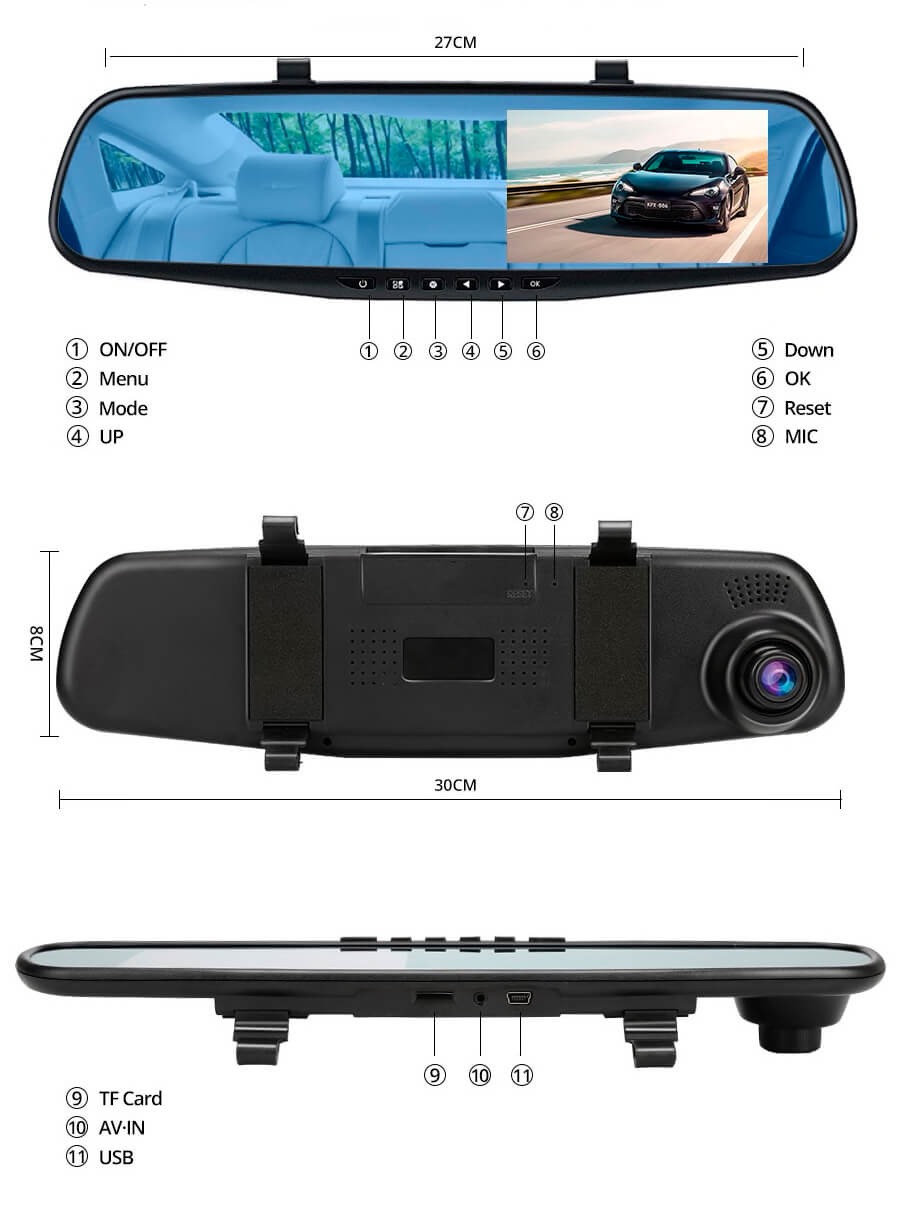 | Функции | Двойная камера, циклическая запись, G-Sensor, обнаружение движения, мониторинг парковки |