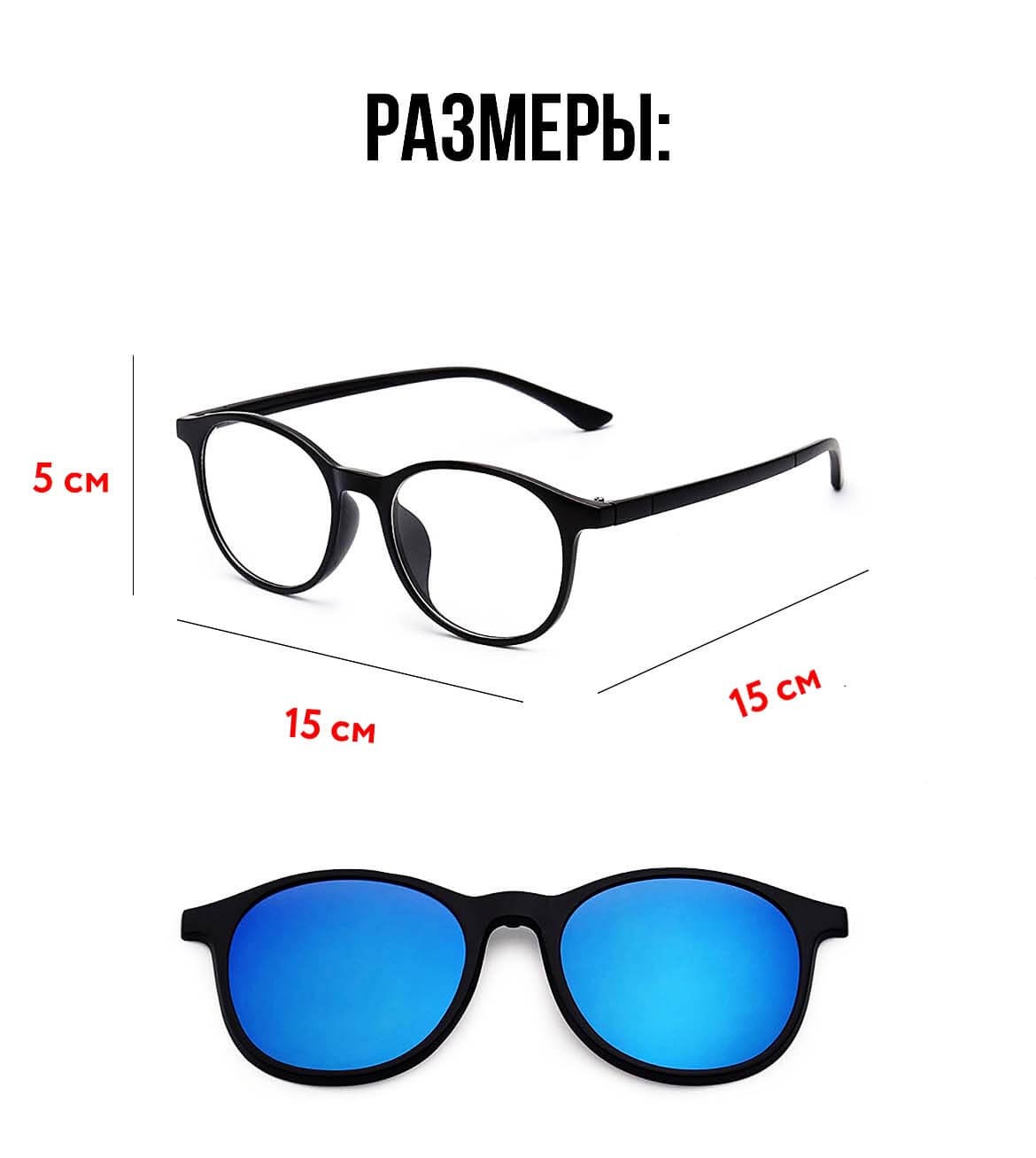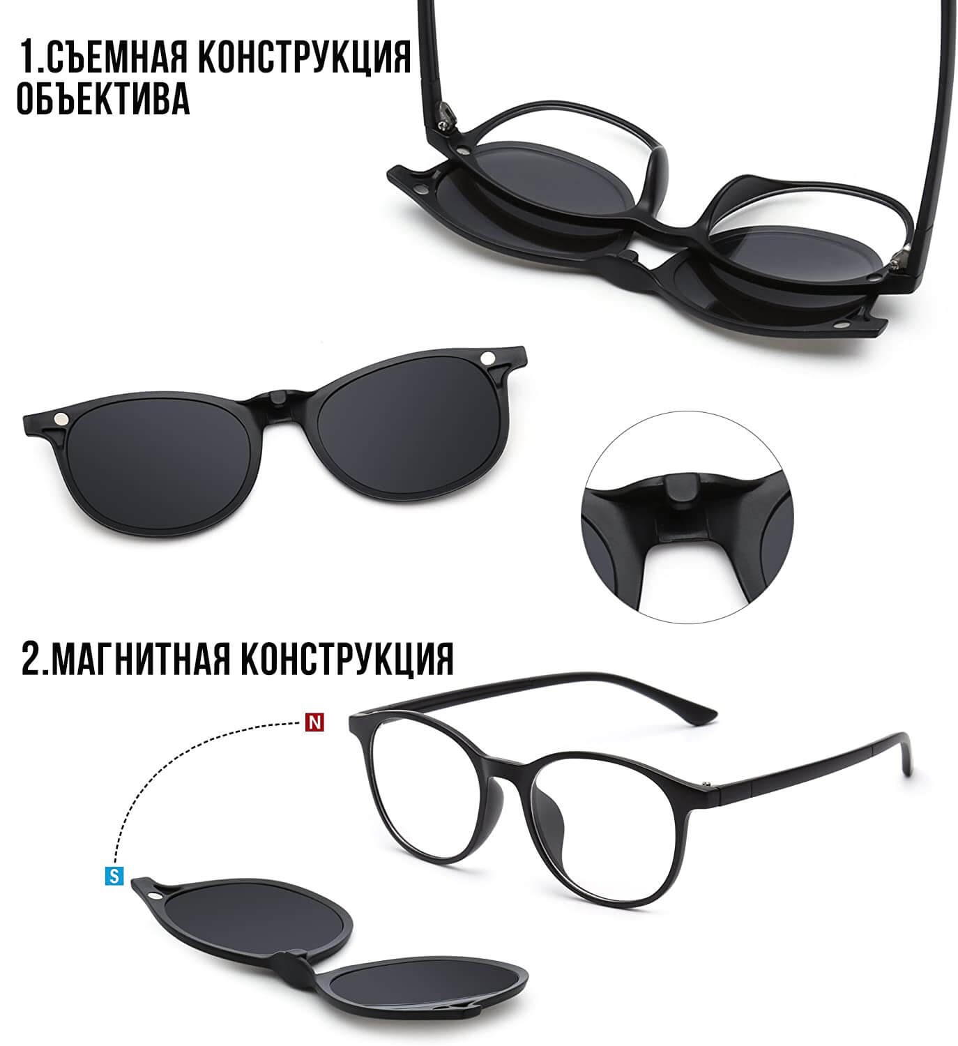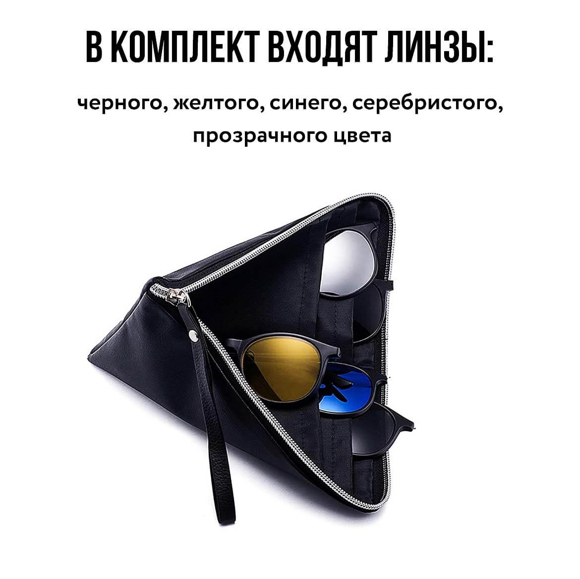 В комплект с прозрачными линзами, входят дополнительные линзы желтого, синего, серебристого, прозрачного цвета, которые крепятся на очки сверху при помощи мощного магнита.