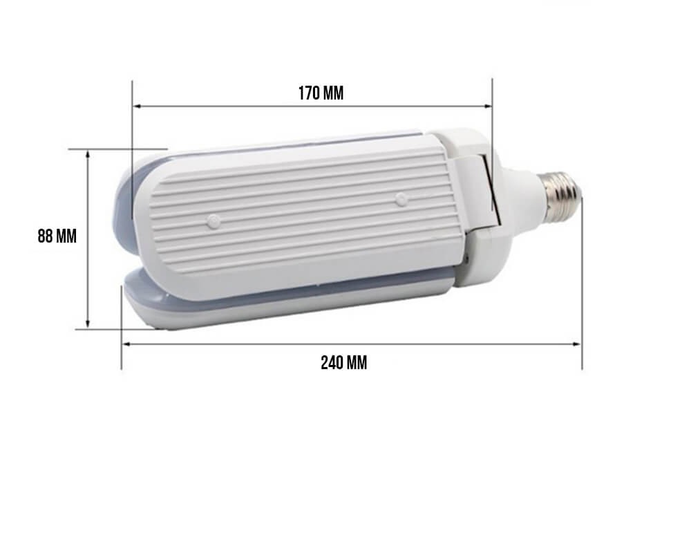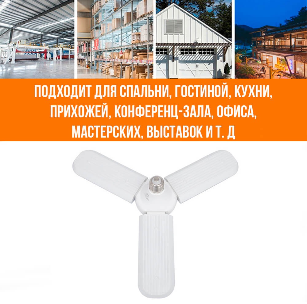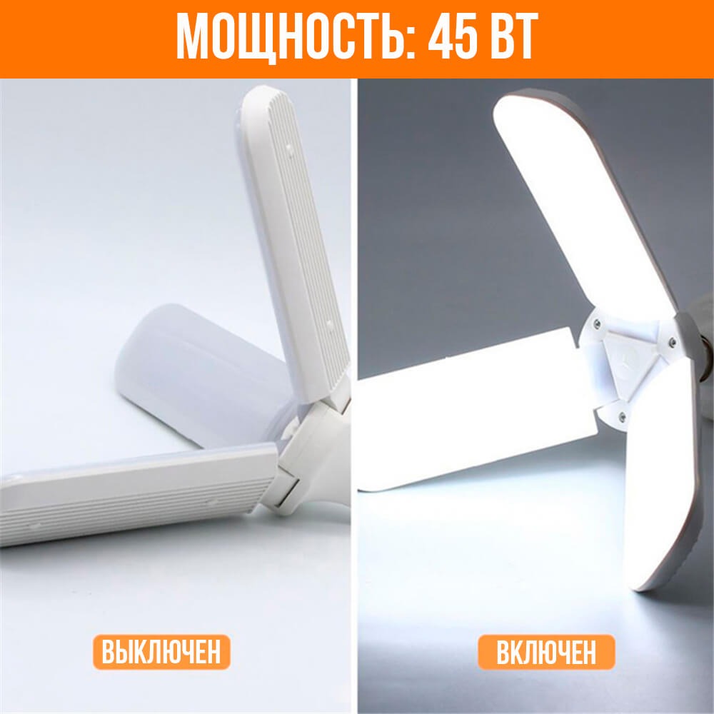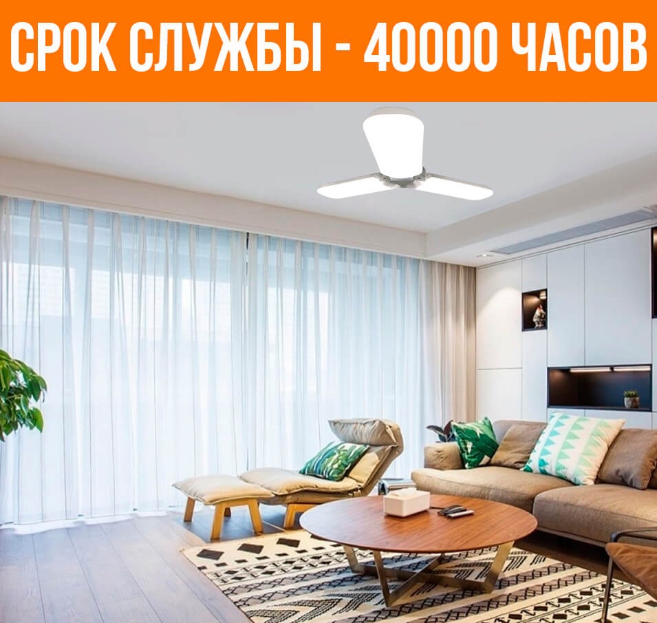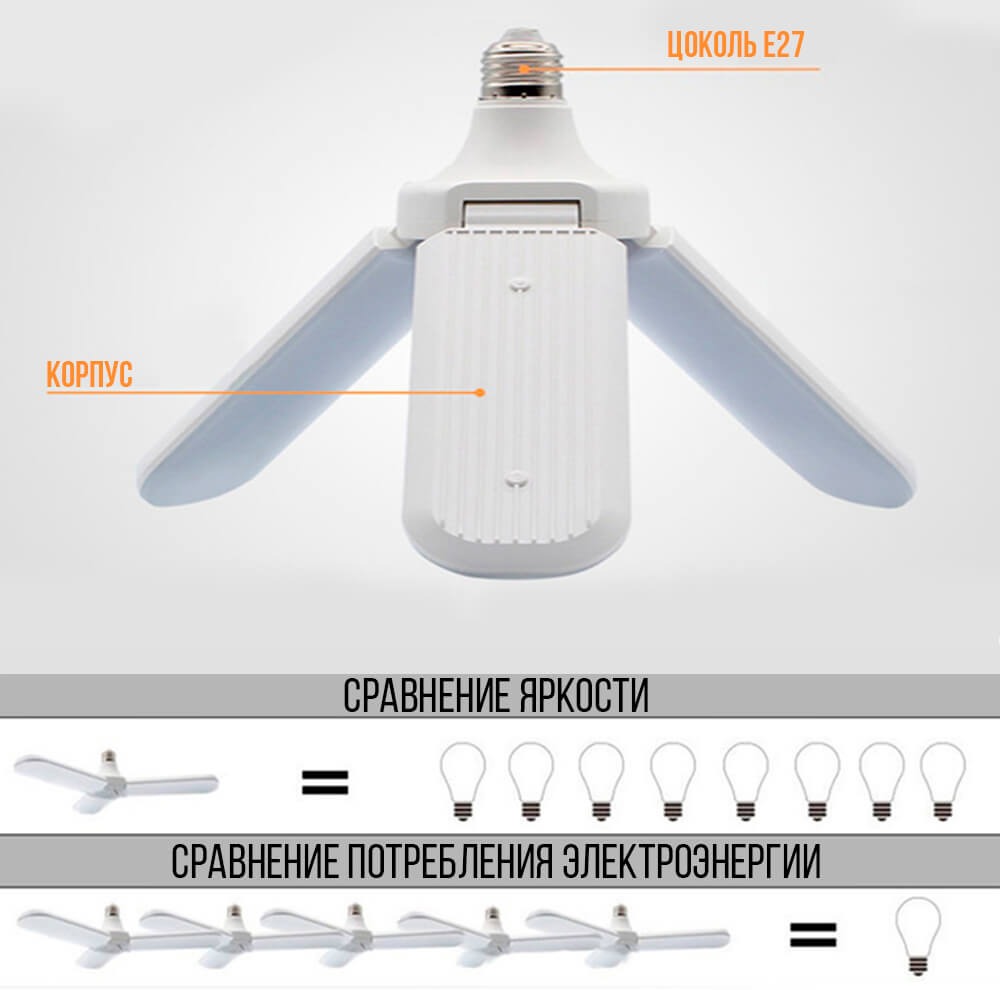 Эта светодиодная лампа отличается не только оригинальным дизайном, но и экологичным и энергосберегающим характером. Ее срок службы составляет 40000 часов, что делает ее отличным выбором для долгосрочного использования. Все лопасти лампы могут складываться под углом 90 градусов, что позволяет удобно хранить ее, когда она не используется.Максимальная потребляемая мощность лампы составляет 45 Вт, подходит для стандартного цоколя E27. Температура цвета колбы достигает 6500 К, что обеспечивает приятный и яркий свет, не вызывающий усталости глаз, что делает лампу столь удобной для чтения или работы.
