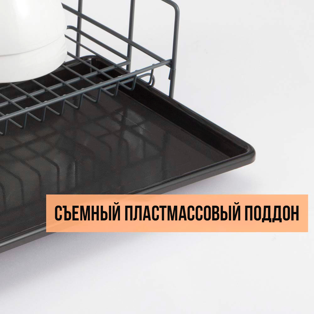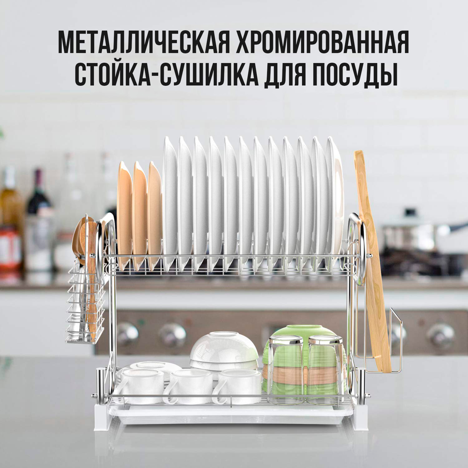 Сушилка для посуды Kitchen rack изготовлена из высококачественной стали с хромированным покрытием. Она защищена от коррозии, что очень важно для такого изделия. Конструктивно предусмотрена возможность установить любые столовые принадлежности. В сушилке есть места для тарелок, чашек, бокалов, вилок и других предметов. Вода с них стекает в пластиковый поддон, который очень легко вынуть, чтобы слить воду. Пластиковые ножки делают конструкцию устойчивой, препятствуют скольжению не царапая поверхности. Сушилка вмещает большой объем посуды, позволяет быстро высушить большое количество тарелок, не занимая много места. Сушилка прочная, долговечная, простая в уходе, имеет привлекательный внешний вид и надежную конструкцию.