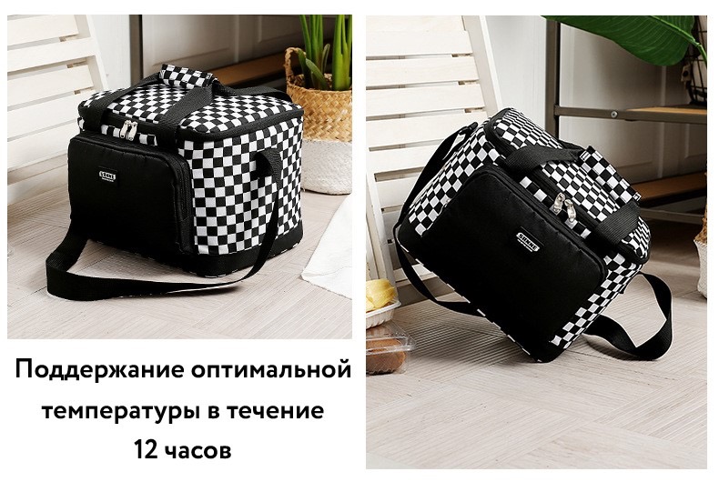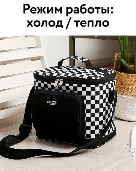 Вес 400 г Высота 30 см Ширина 21 см Длина 21 см Поддержание температуры с использованием аккумуляторов. холода 12 часов Карманы для аксессуаров Есть Материал 600 D полиестер Подкладка Алюминиевый термопласт Принт Шахматный Режим работы Холод/тепло
