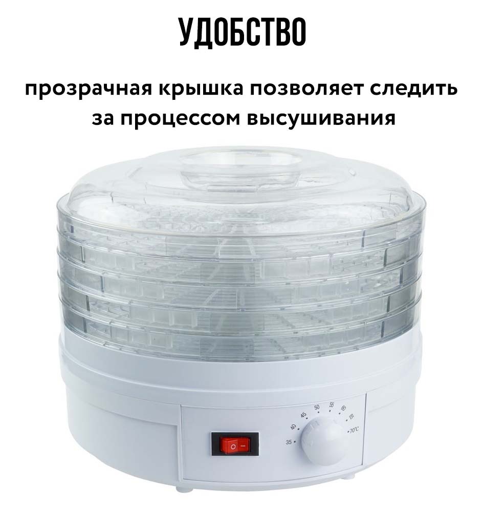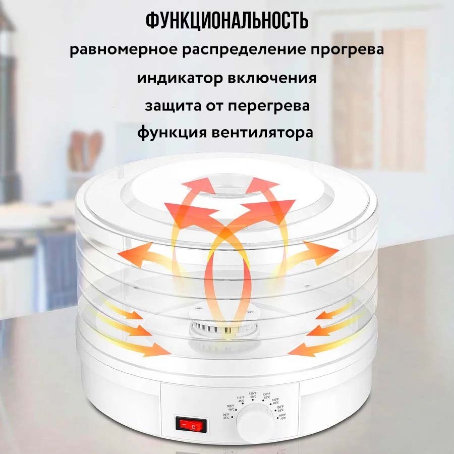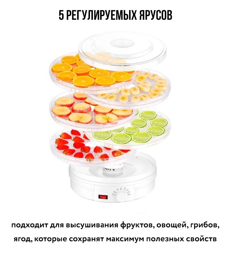 Имеет 5 регулируемых ярусов, на которые можно поместить большое количество продуктов различной формы и размера. Кроме того, она оснащена таймером и регулятором температуры, что позволяет настроить процесс сушки под свои потребности. В целом, сушарка – это надежный и удобный инструмент, который поможет сохранить пользу и вкус ваших любимых продуктов.