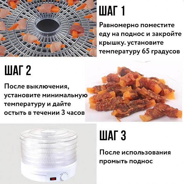 | Комплектация | Сушилка для овощей и фруктов, 2.5 кг; Прозрачная крышка; Пять съемных пластиковых поддонов; Инструкция; Упаковка |