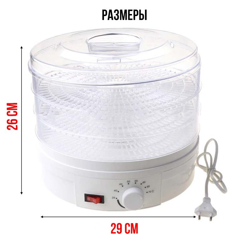 Мощность: 800W Диапазон температур: 35-70°C Защита от перегрева: да Количество уровней сушки: 5 Материал: пищевой пластик, металл - 23х32х32 см