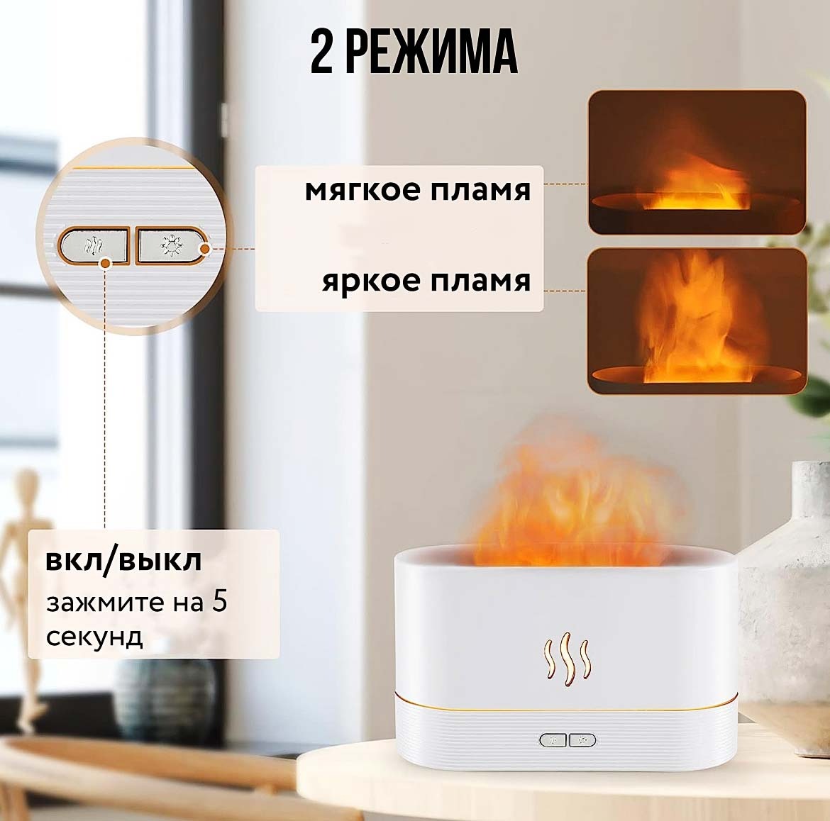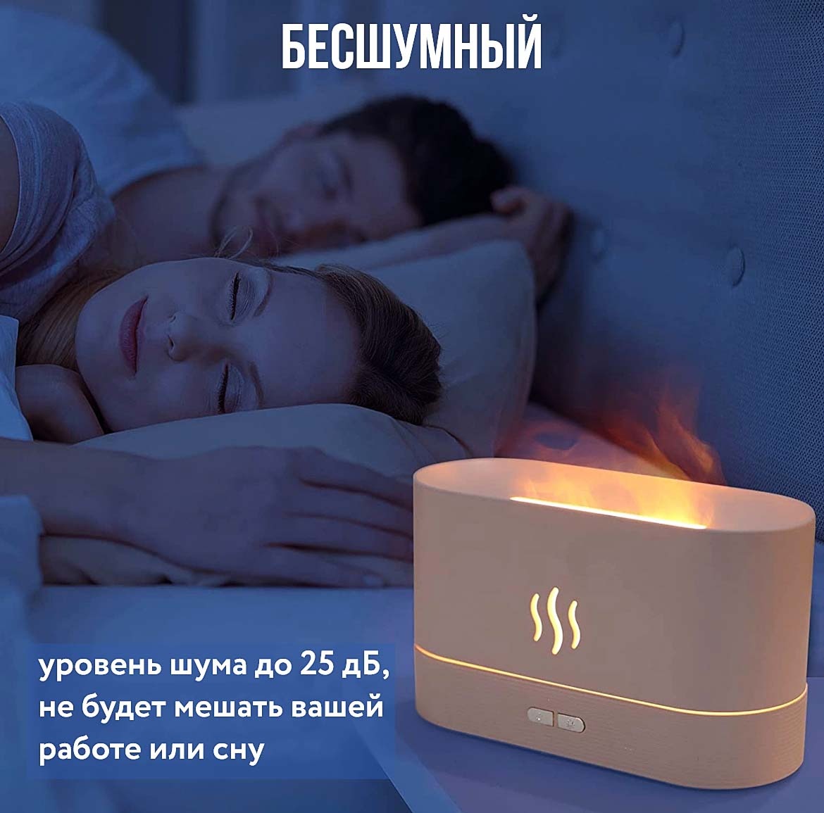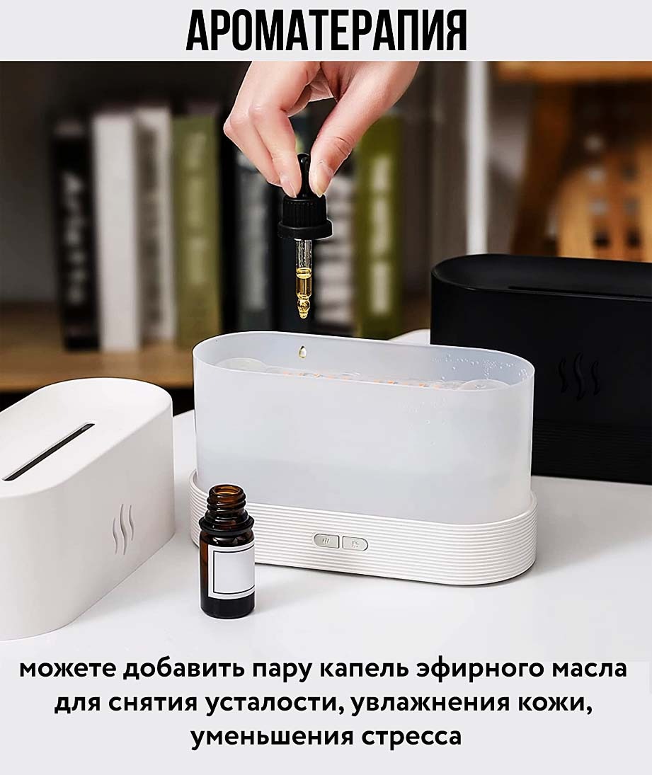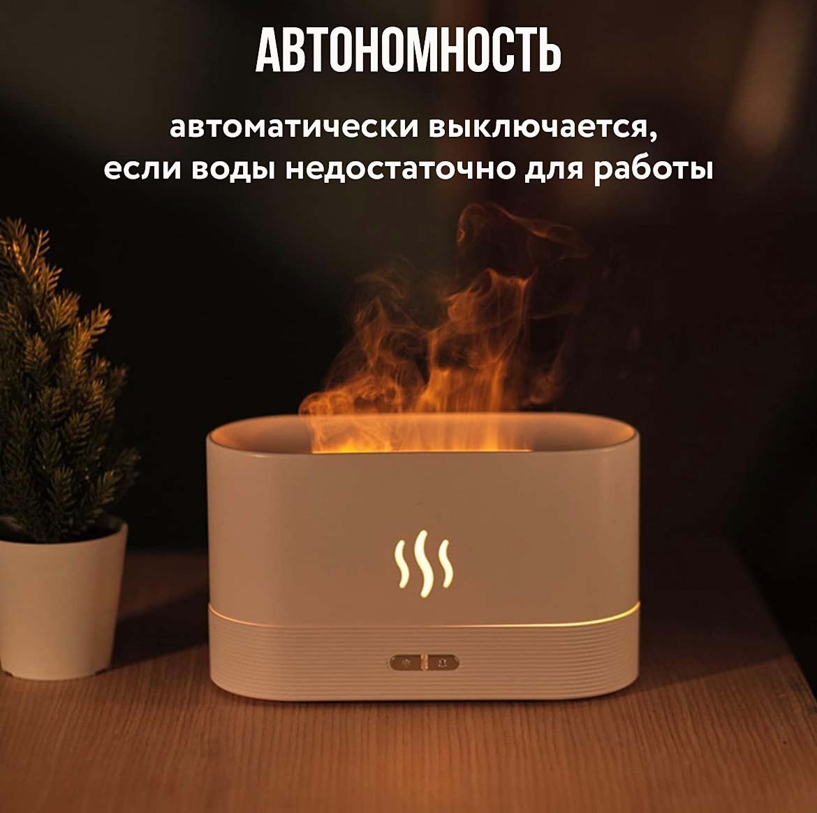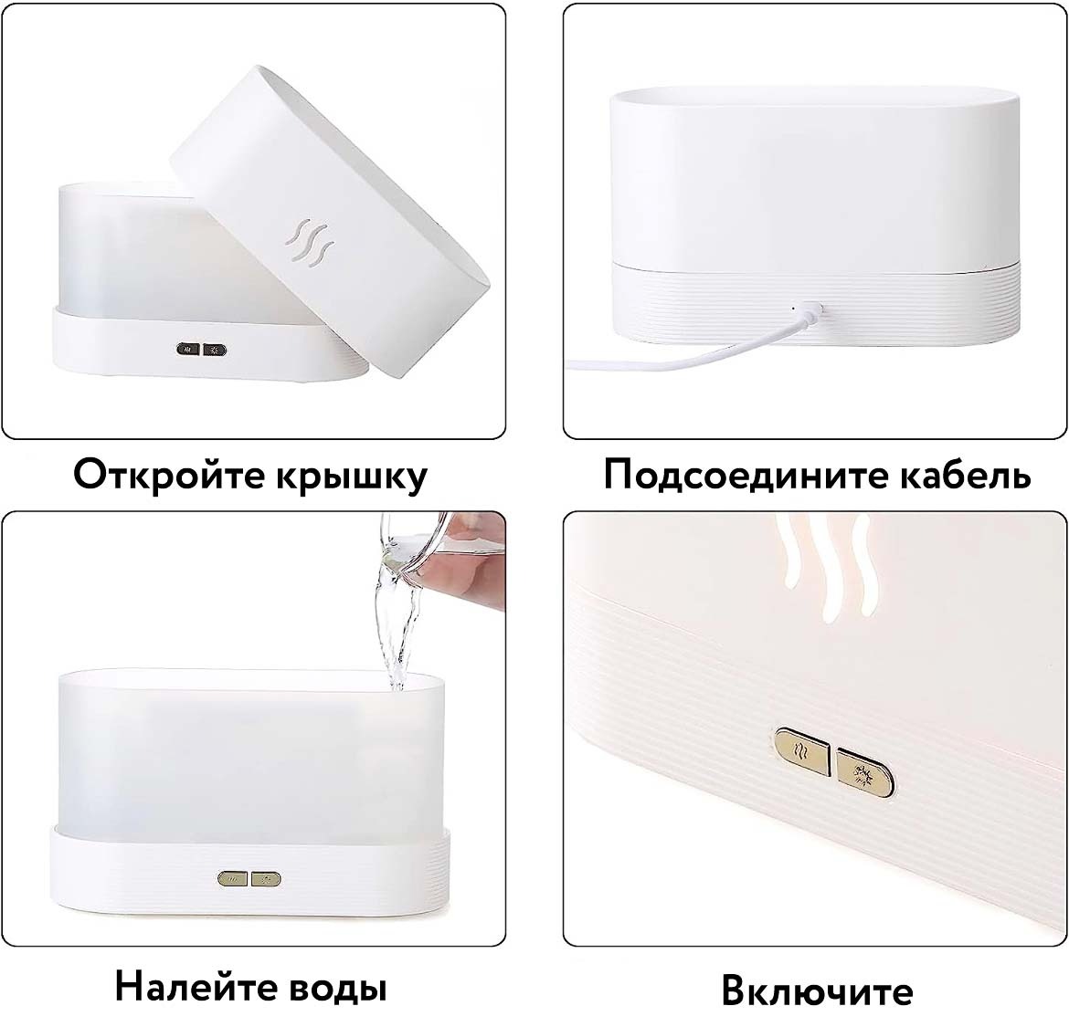 Портативный увлажнитель воздуха и аромадифузор, который оснащен функцией имитации пламени и имеет белый цвет корпуса. Этот увлажнитель воздуха является электрическим устройством, помогающим увлажнять воздух в помещении, особенно в зимний период, когда воздух может стать слишком сухим из-за работы отопительных систем. Устройство имеет встроенный резервуар для воды, позволяющий ему работать в течение длительного времени без необходимости постоянной замены воды. Кроме того, этот увлажнитель также может использоваться в качестве аромадифузора, который распыляет ароматические масла в воздухе, что создает приятную атмосферу в помещении. Функция имитации пламени добавляет эстетическую составляющую, создавая впечатление настоящего огня, но не создает никакого тепла, что делает устройство безопасным для использования. Устройство компактное и портативное, что позволяет легко перемещать его из комнаты в комнату. Оно имеет простой и удобный в использовании дизайн, позволяющий контролировать интенсивность увлажнения воздуха и количество ароматических масел, которые вы хотите использовать. В общем это удобный и многофункциональный увлажнитель воздуха, который может улучшить качество воздуха в помещении и создать приятную атмосферу.