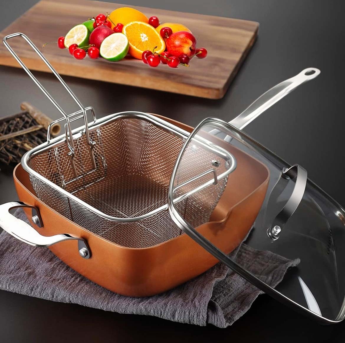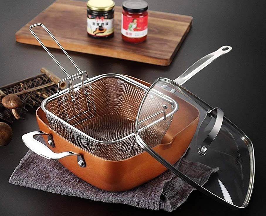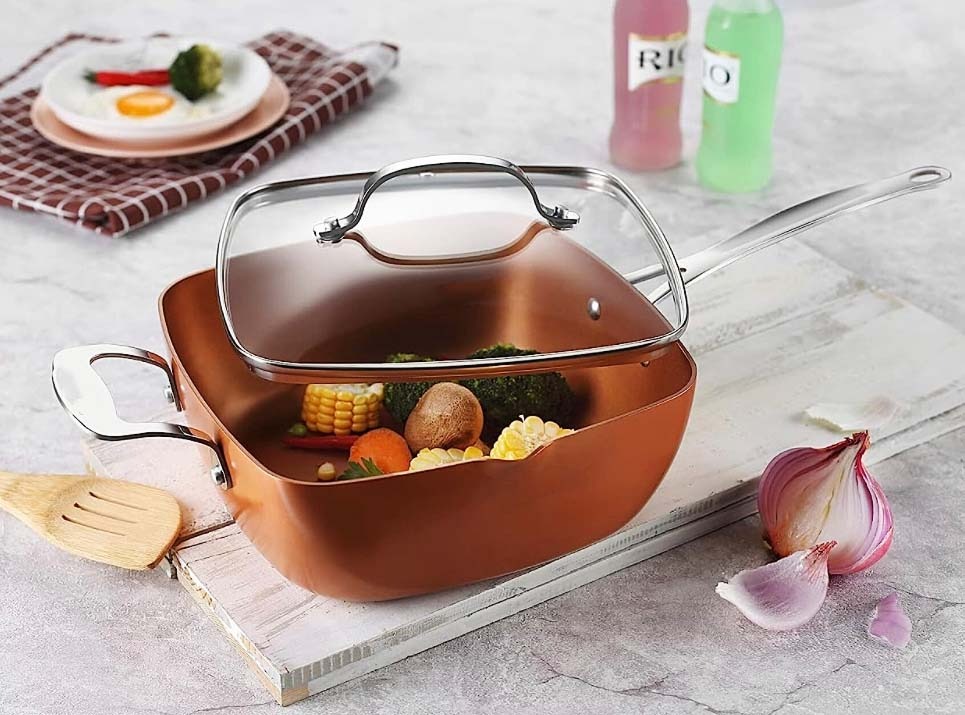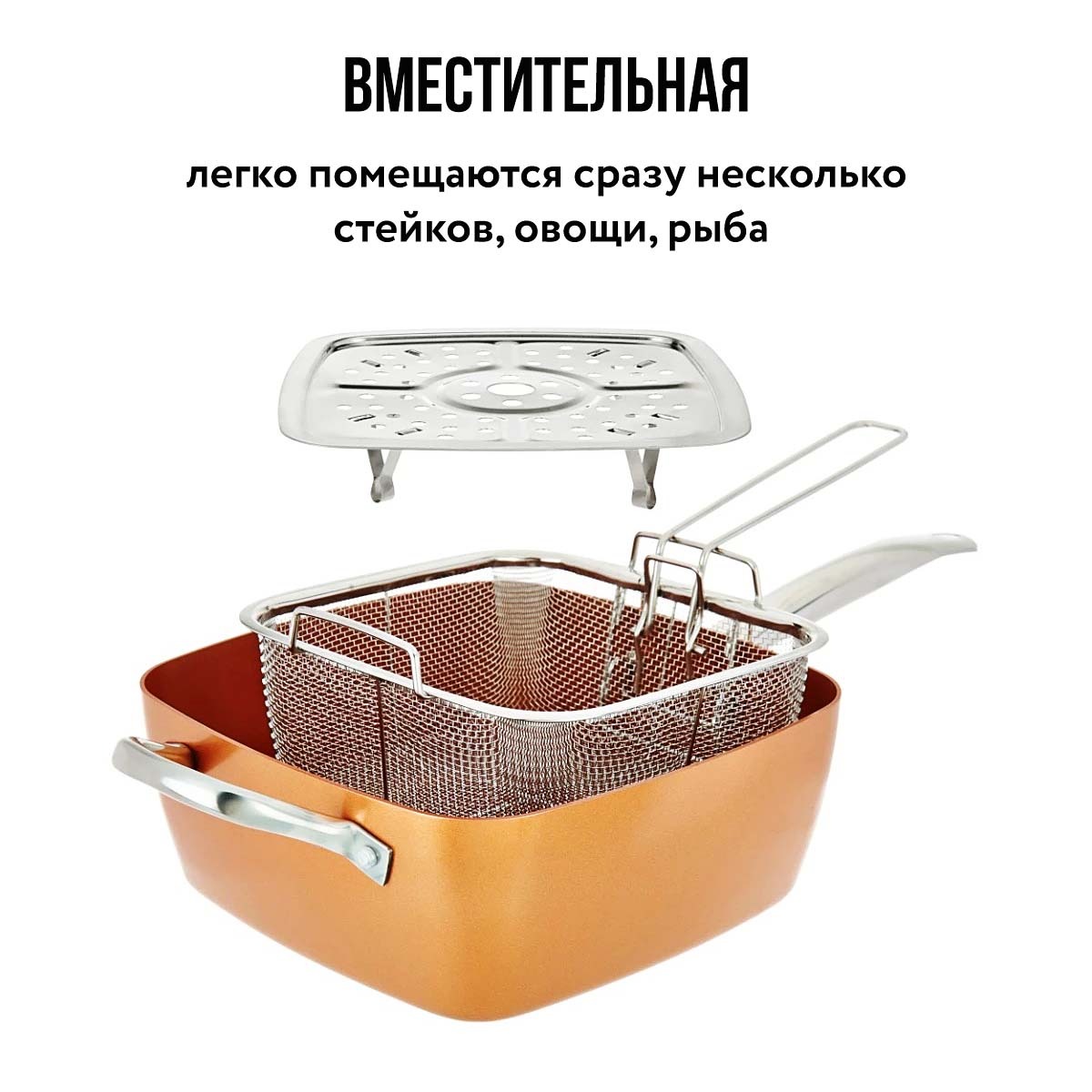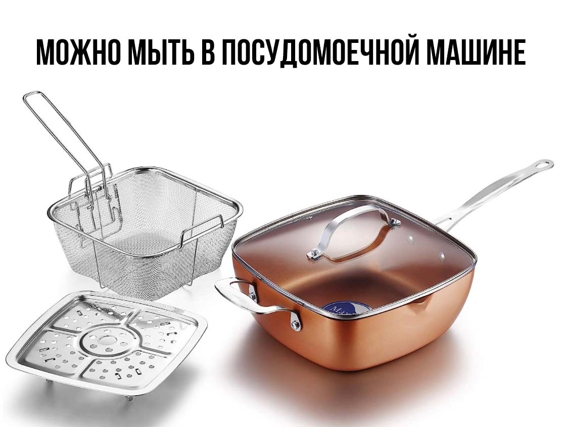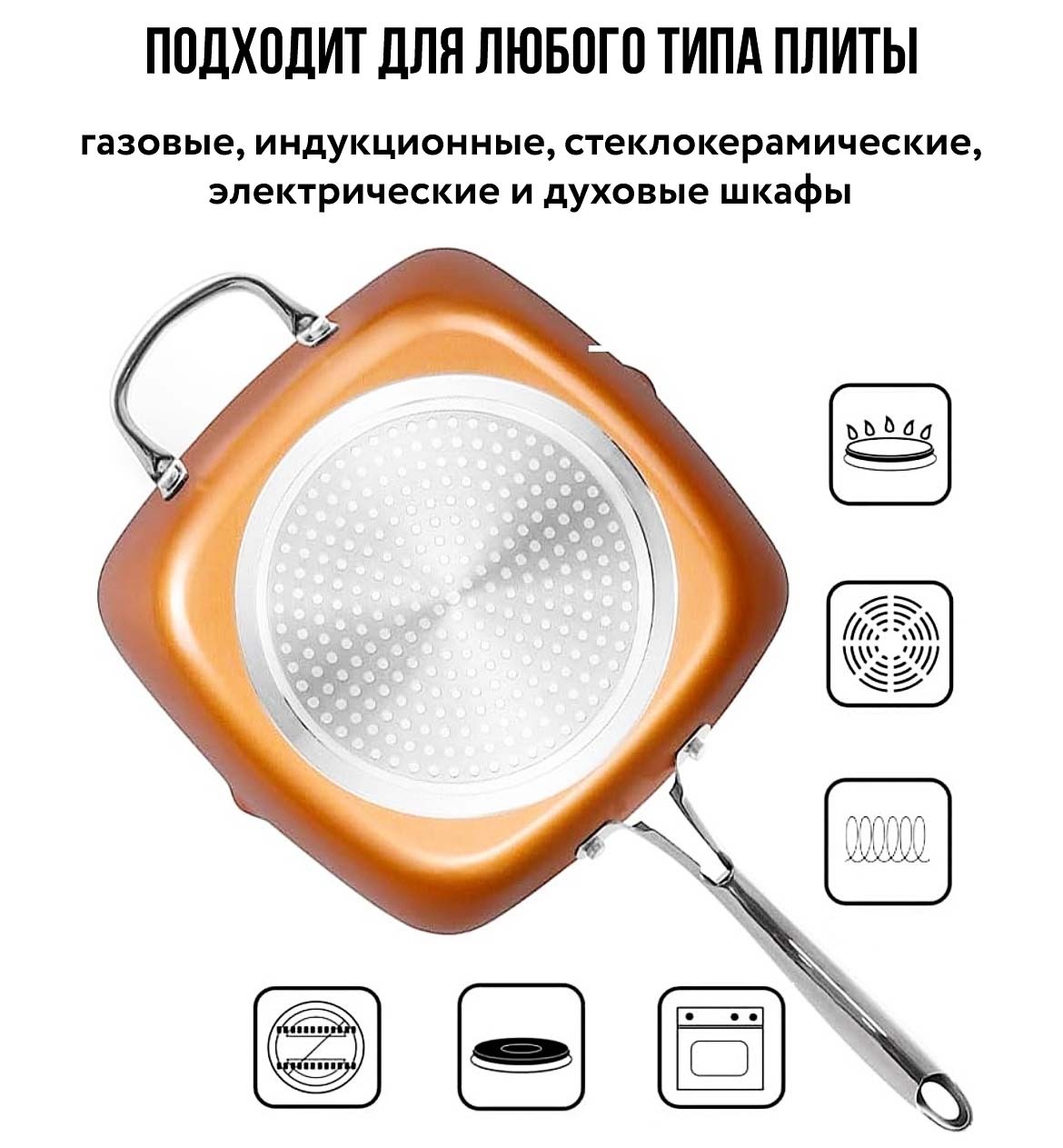 Разработка обладает антипригарным покрытием из меди и керамики. Состоит из уникального сплава с керамическим напылением. Характеризуется стойкостью к царапинам и механическим повреждениям. Подходит для абсолютно любых продуктов. Отличительными чертами подобной сковороды также служат десятисантиметровая высота бортиков и квадратная форма. Дно сковороды также покрыто алюминиевыми пластинами.