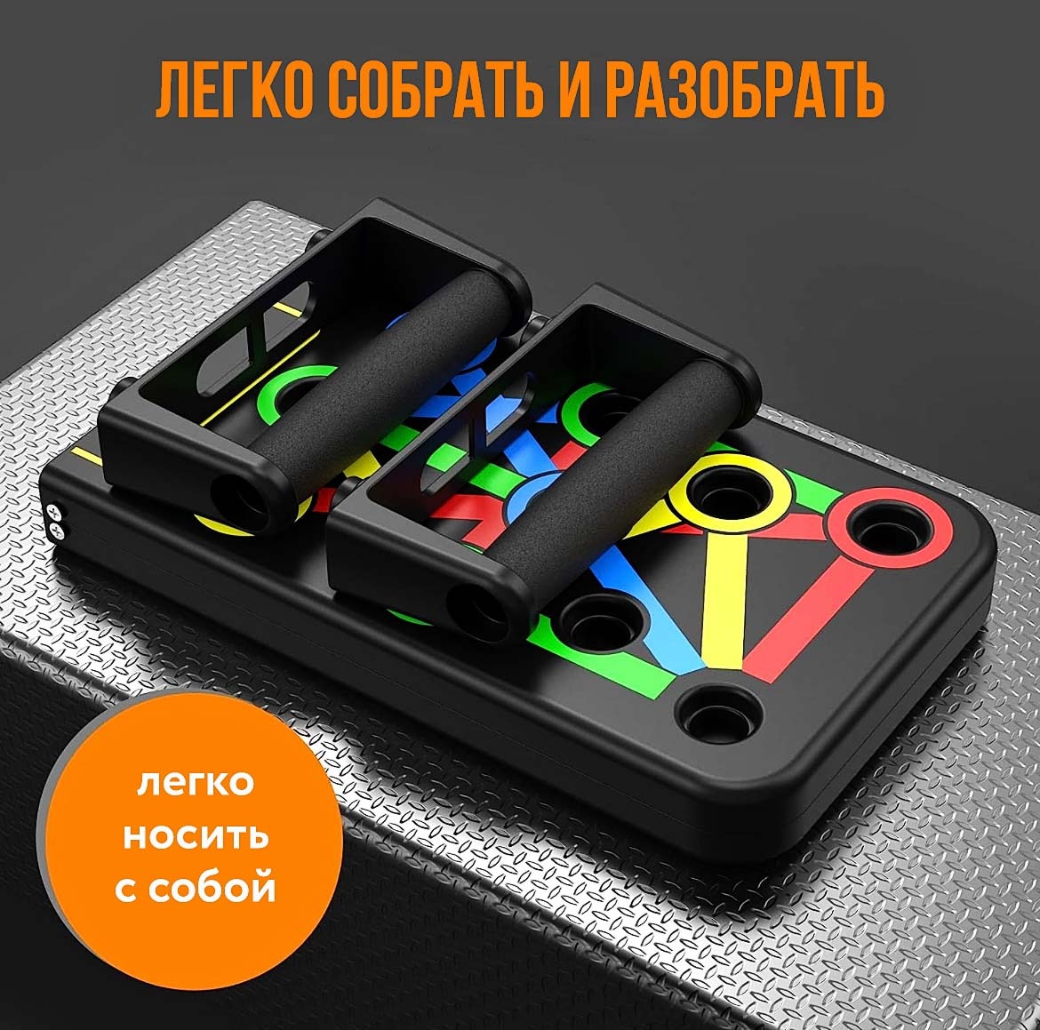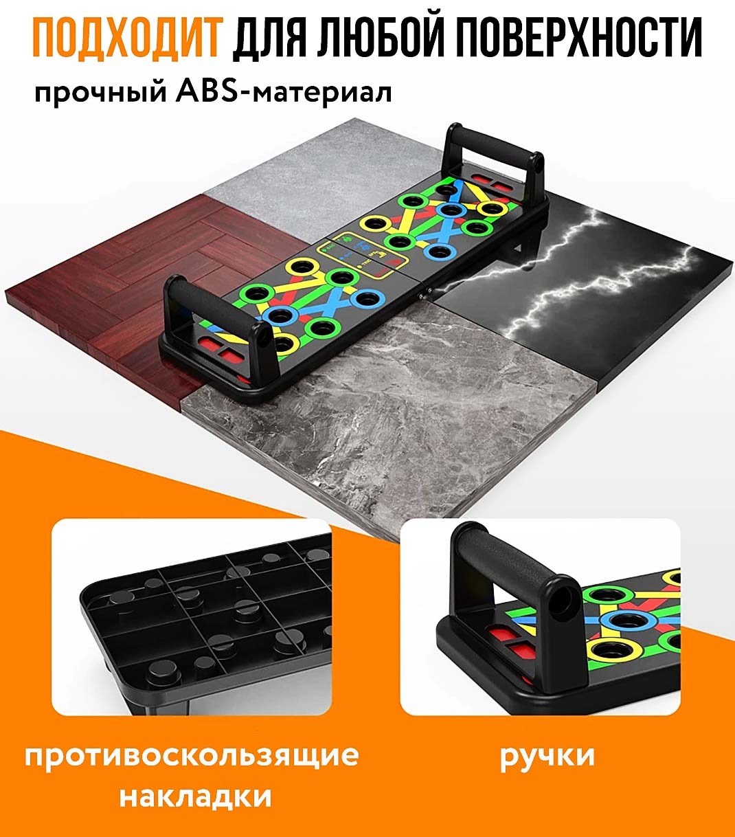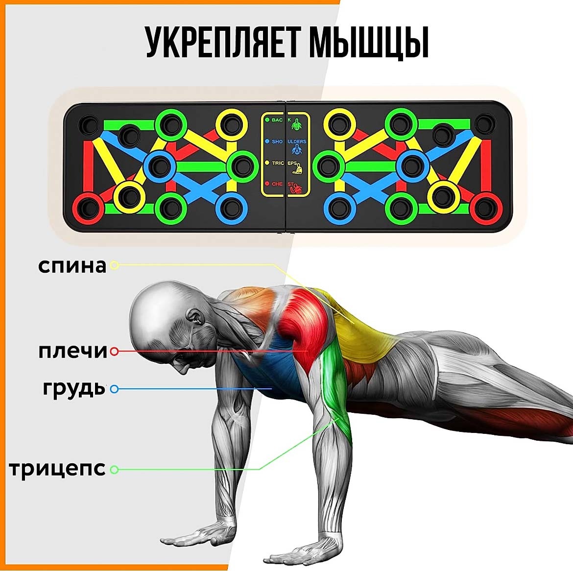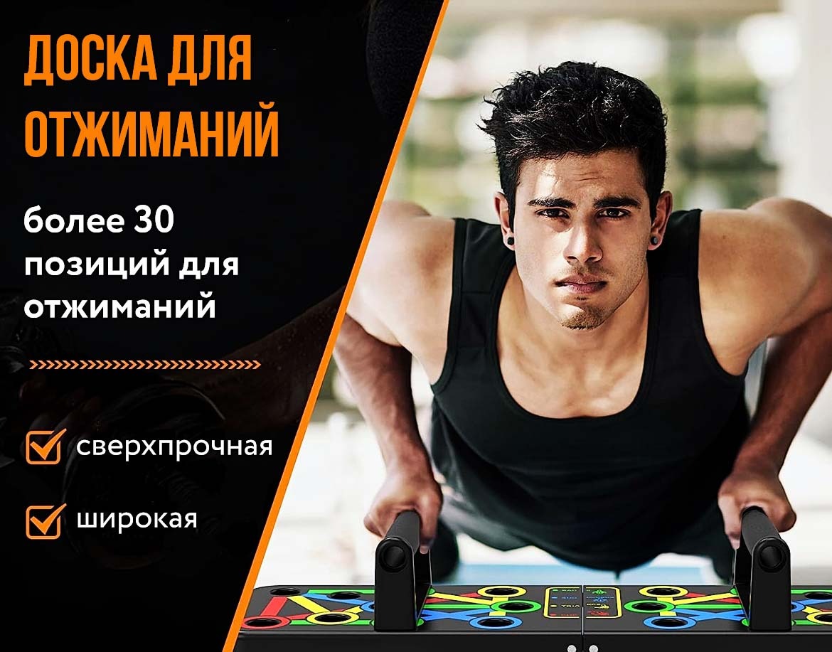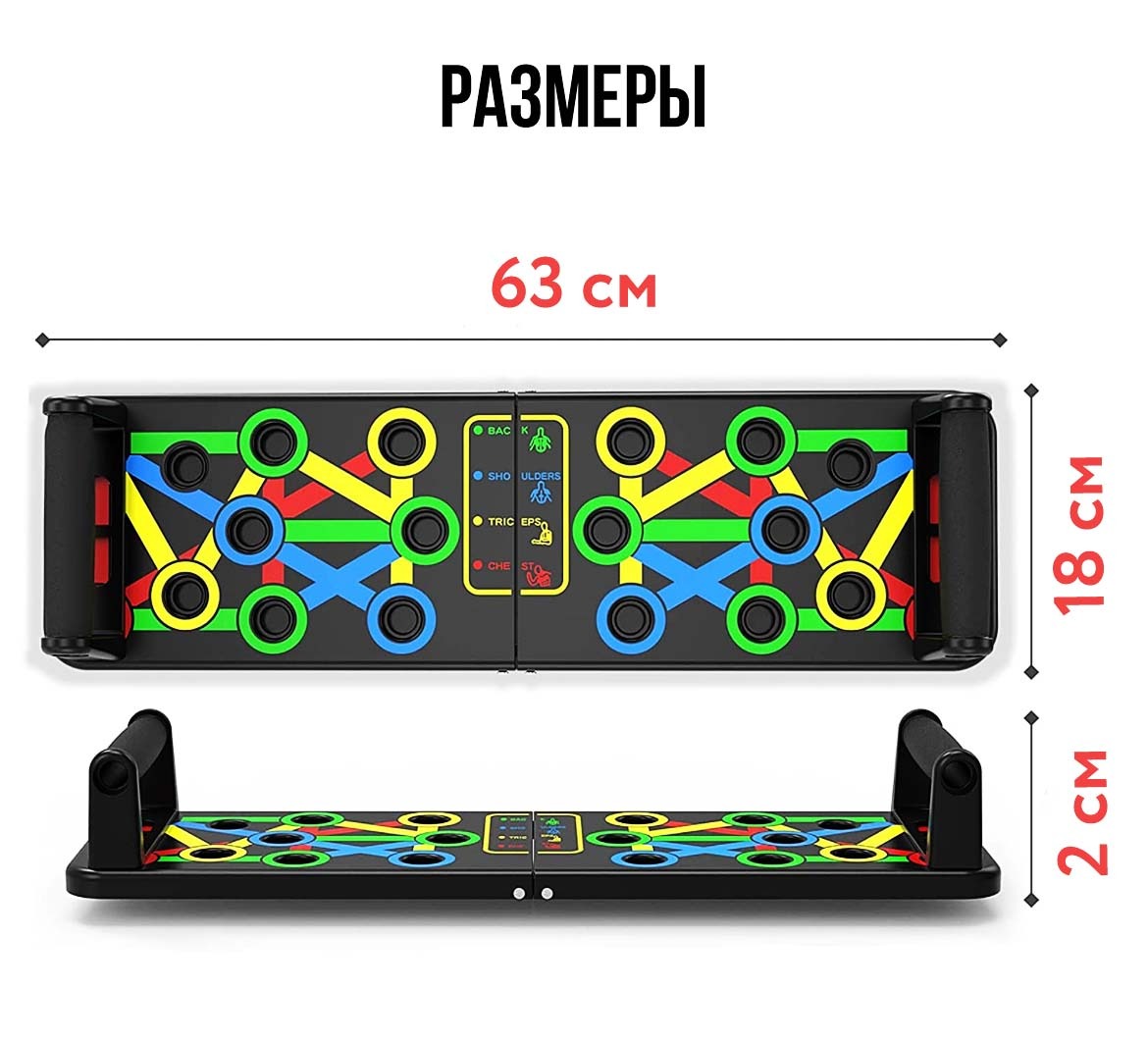 Спортивная доска с упорами для отжиманий, размеченная по специальной системе упражнений на различные группы мышц и зон торса - плечи, спину, руки, грудь. Упоры позволяют опускать тело ниже, нежели при обычных отжиманиях – это создает более широкую амплитуду, что, в свою очередь, позволяет проработать мышцы гораздо эффективнее .