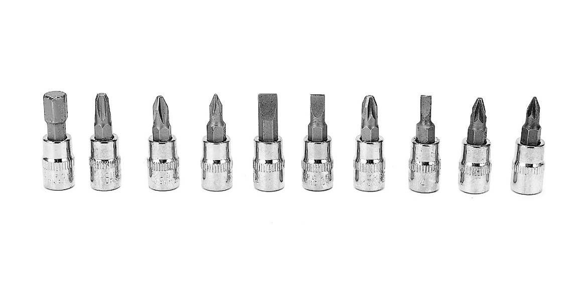 - Головка шестигранная торцевая (1⁄4") - 13 шт (4, 4.5, 5, 5.5, 6, 7, 8, 9, 10, 11, 12, 13, 14 мм)