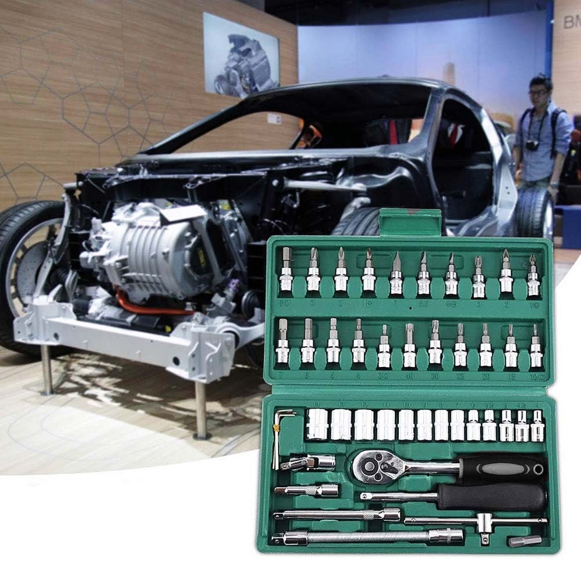 Удобный и компактный набор инструментов 46 элементов сделан из прочной хромированной стали, выдерживающей небывалые нагрузки. Удобные пластиковые ручки на трещотке и отвертке позволяют инструментом удобно держаться в руке.