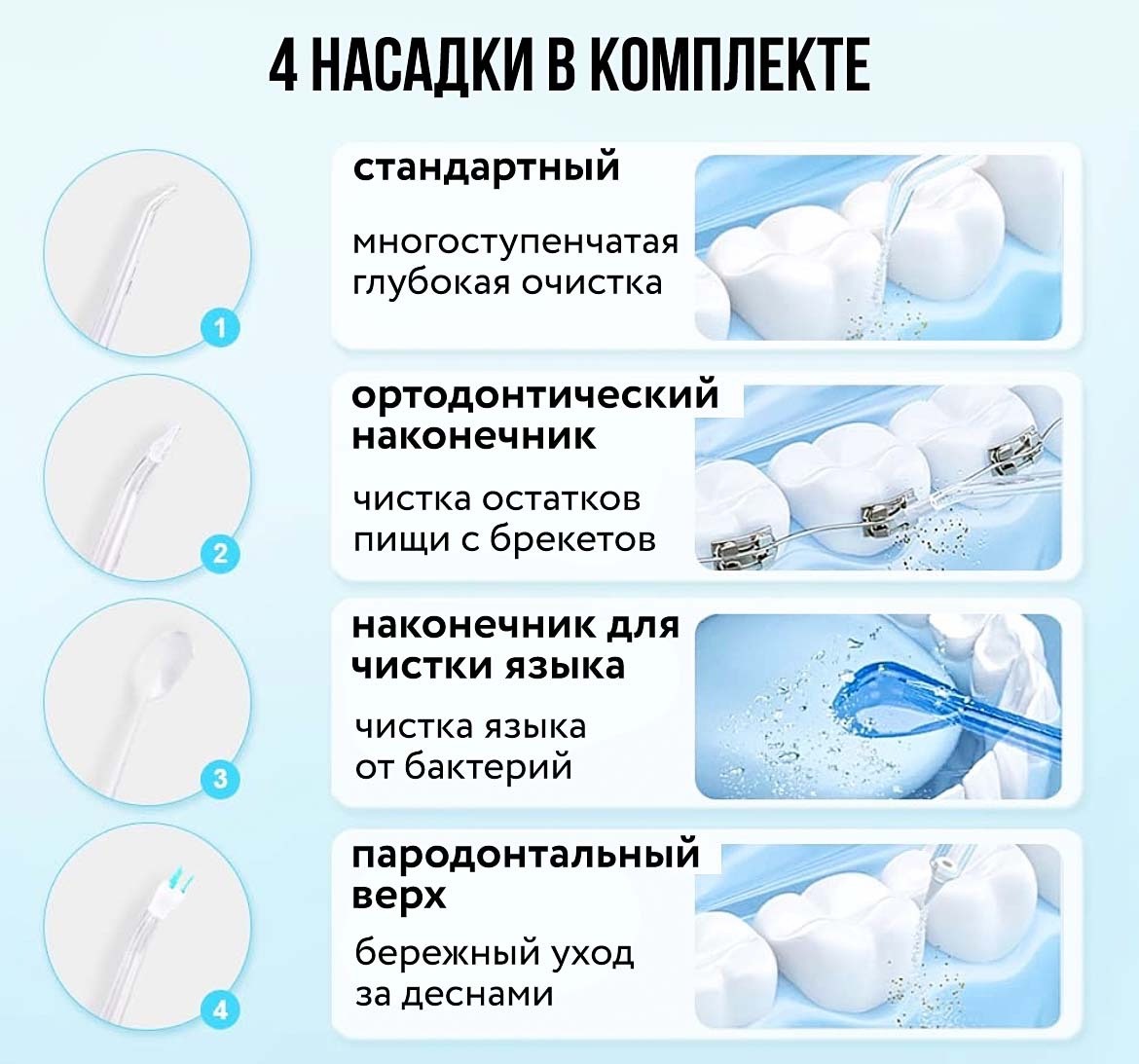 - Отлично подходит для ухода за брекет-системами, протезами, имплантами, мостами;