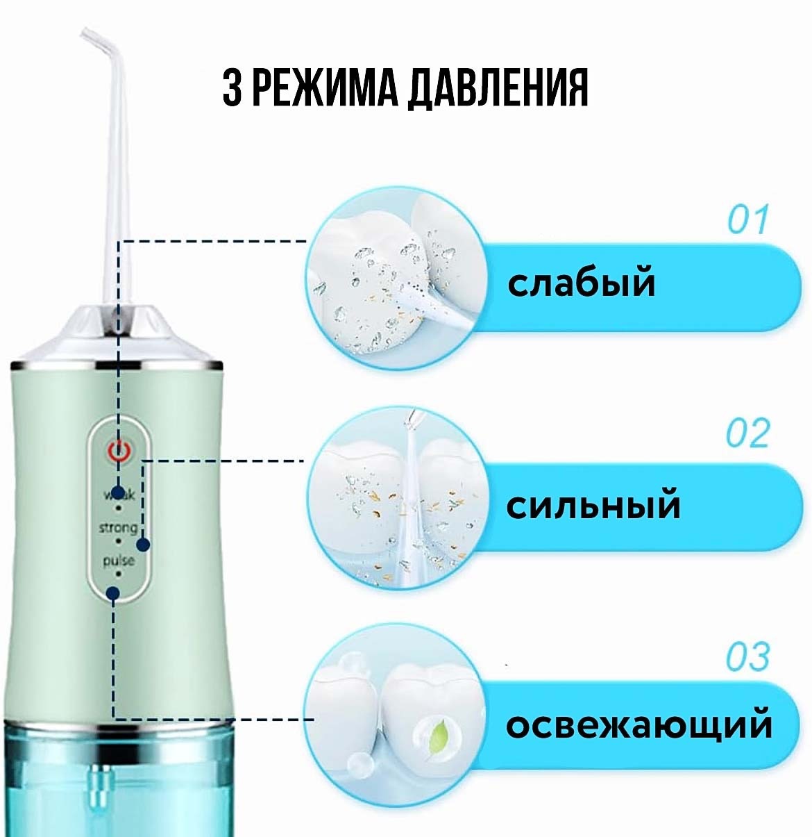 Большой резервуар для воды на 220 мл, подходит для полоскания рта несколько раз в день. Резервуар для воды съемный, его легко наполнять и чистить. Зубной ирригатор имеет 3 режима: включения/выключения и переключения скоростей, а также сопло, вращающееся на 360 °, так что вы можете легко очистить труднодоступные места полости рта, позаботиться о брекет-системах и имплантах (пространствах между зубами, зубодесневых складок), осуществить мягкий массаж и улучшить кровообращение дёсен.