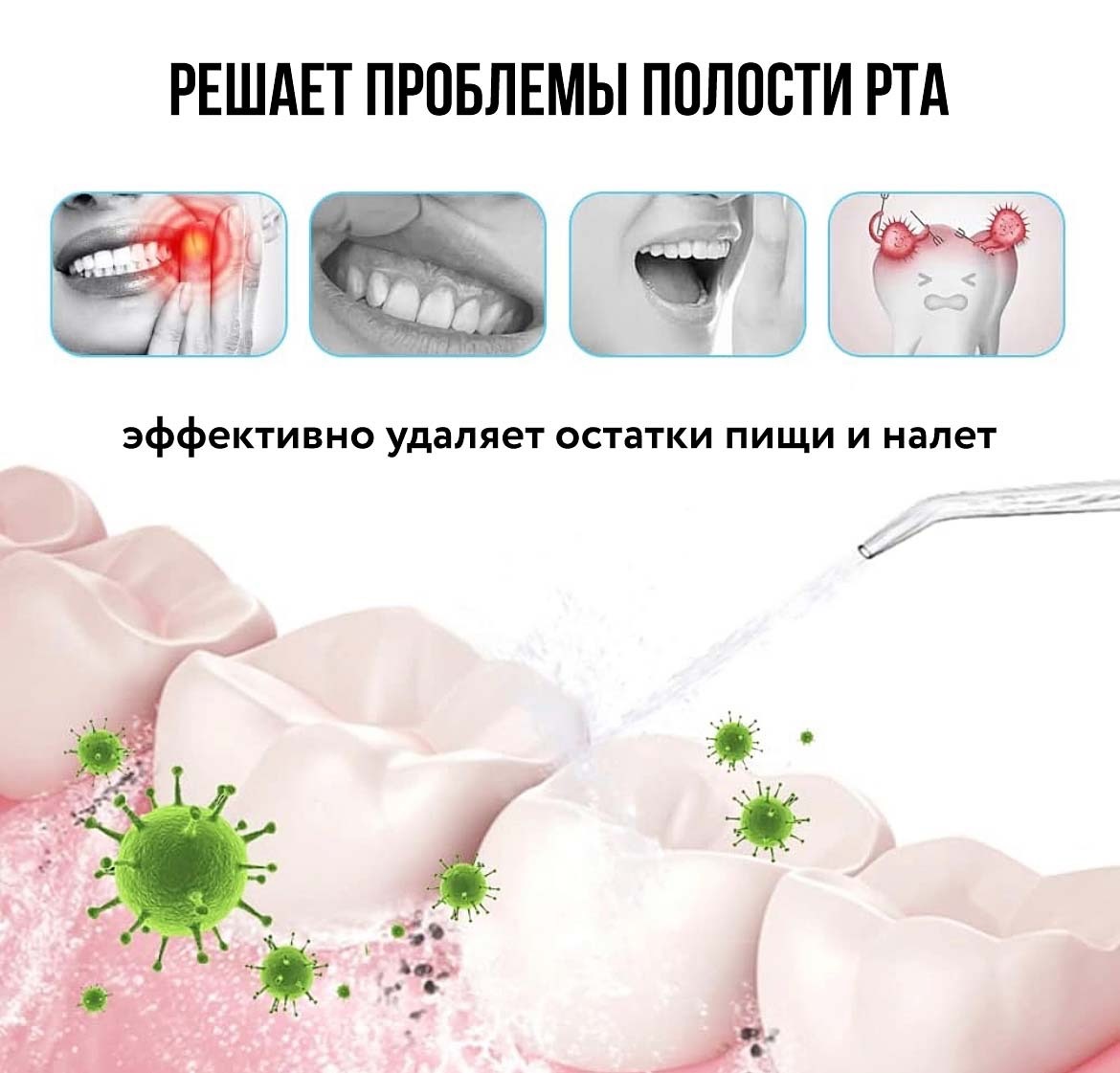 Ирригатор работает по принципу гидромассажного воздействия: направленная пульсирующая струя воды обеспечивает глубокую очистку в местах, недоступных для зубной щетки, а также бережно укрепляет десны.
