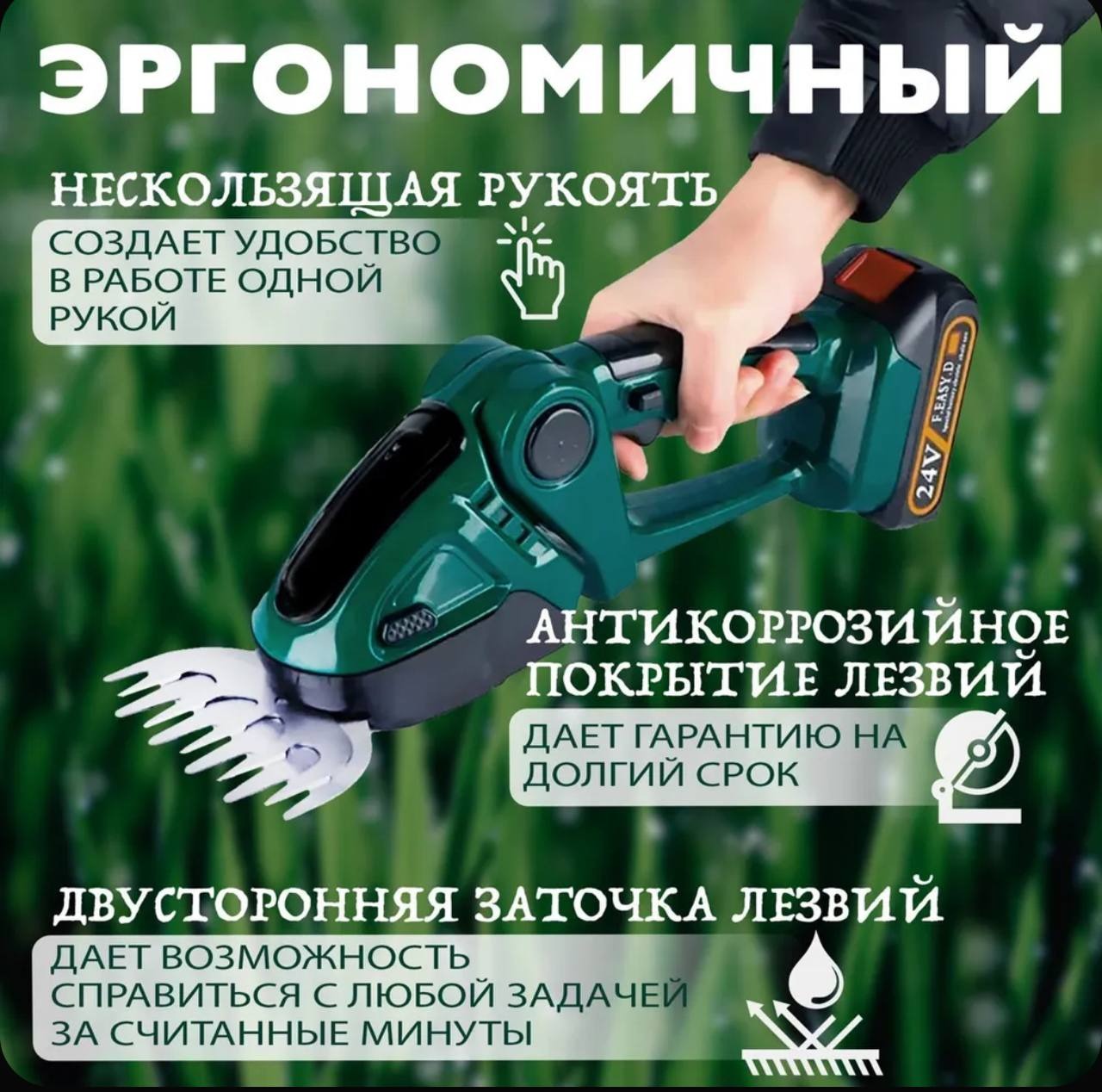 Аккумуляторные садовые ножницы-кусторез 24V — это современный и удобный инструмент для ухода за газоном и кустарниками. Они предназначены для быстрой и точной стрижки травы, а также подрезки кустов, обеспечивая аккуратный и ухоженный вид вашему участку.