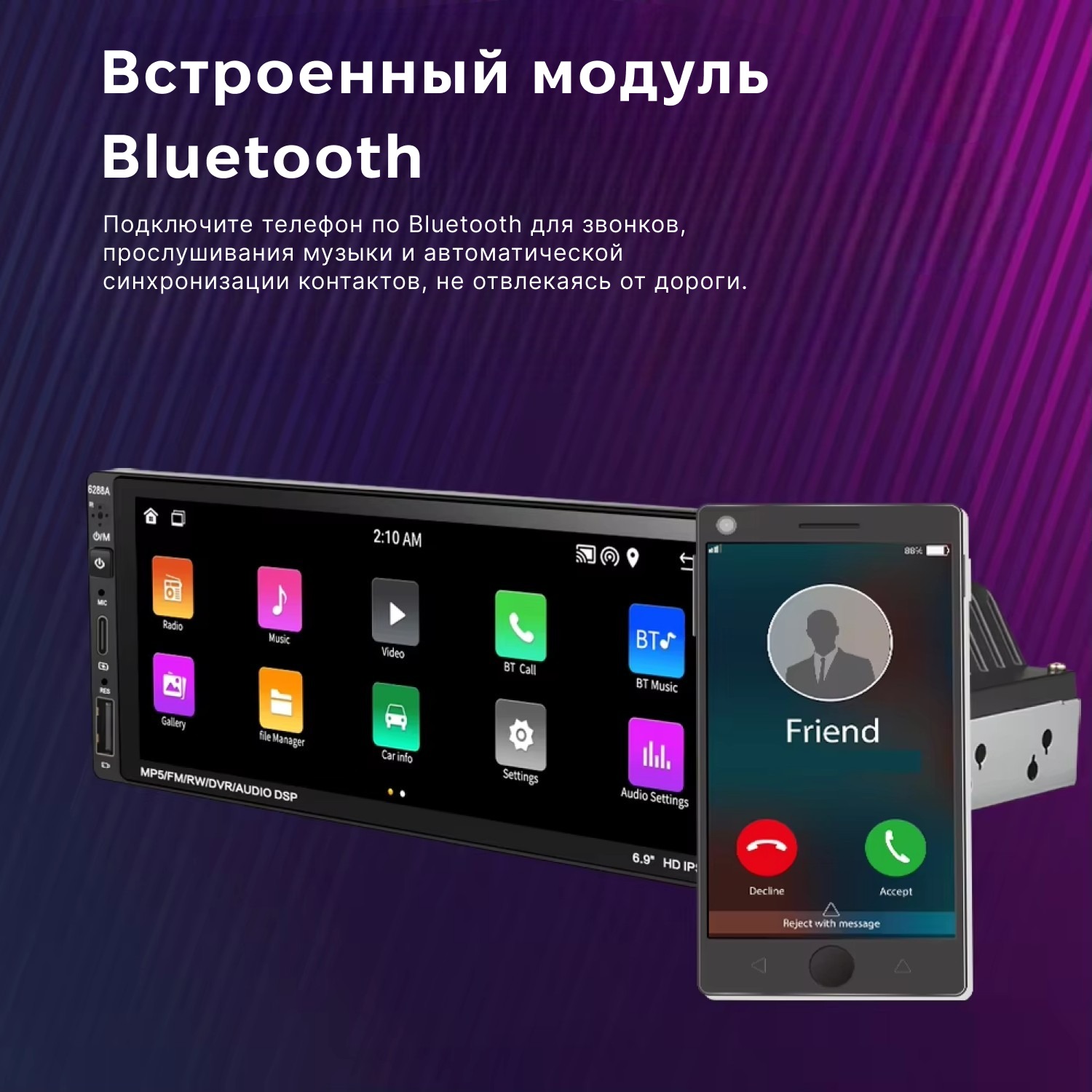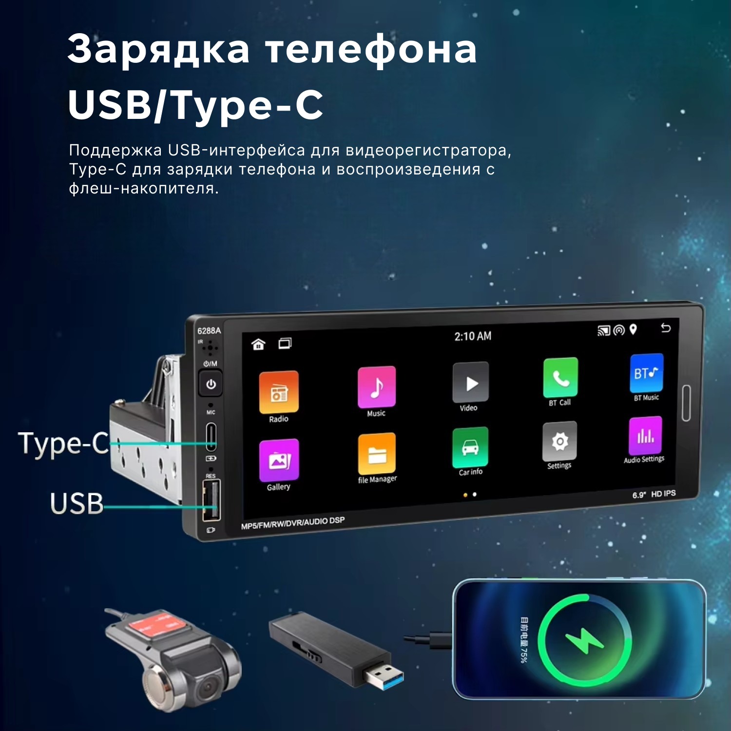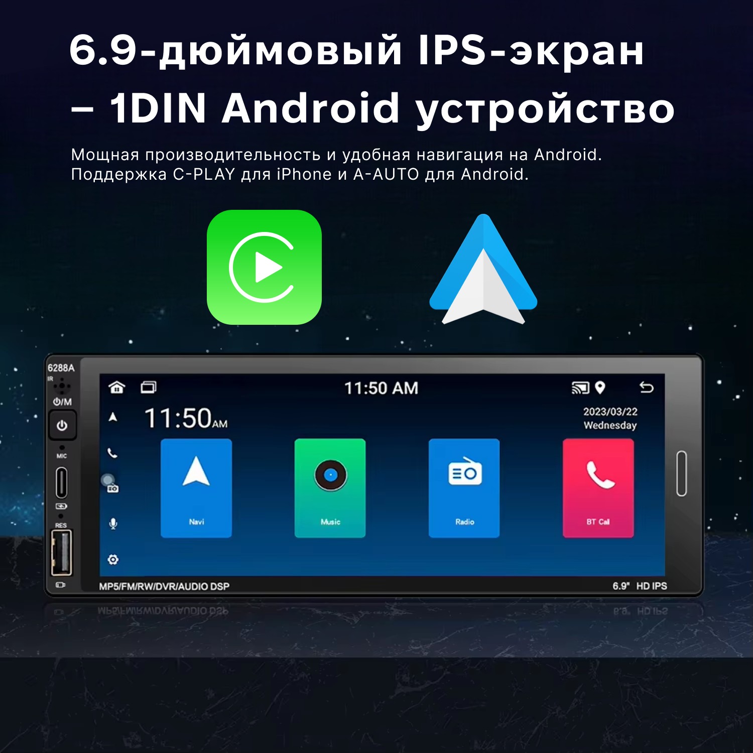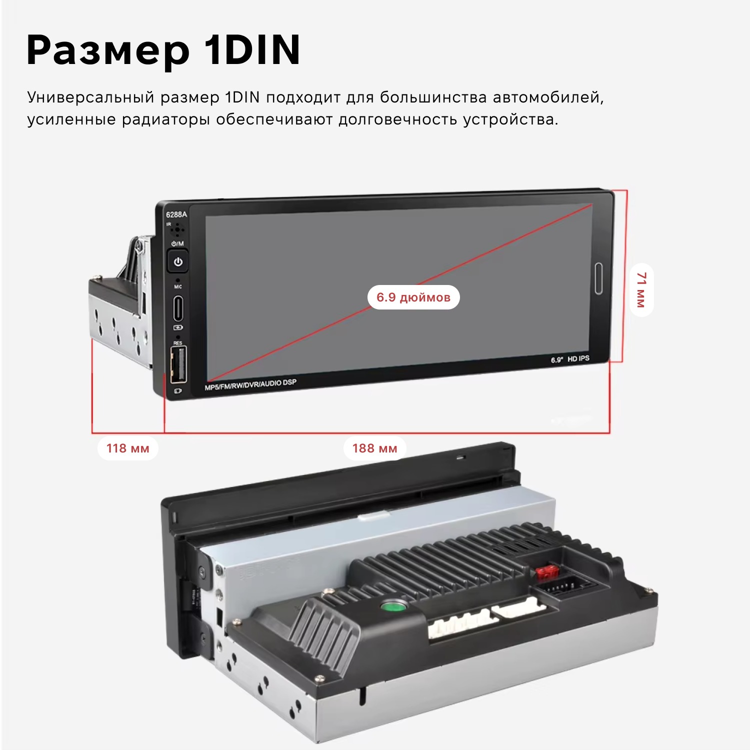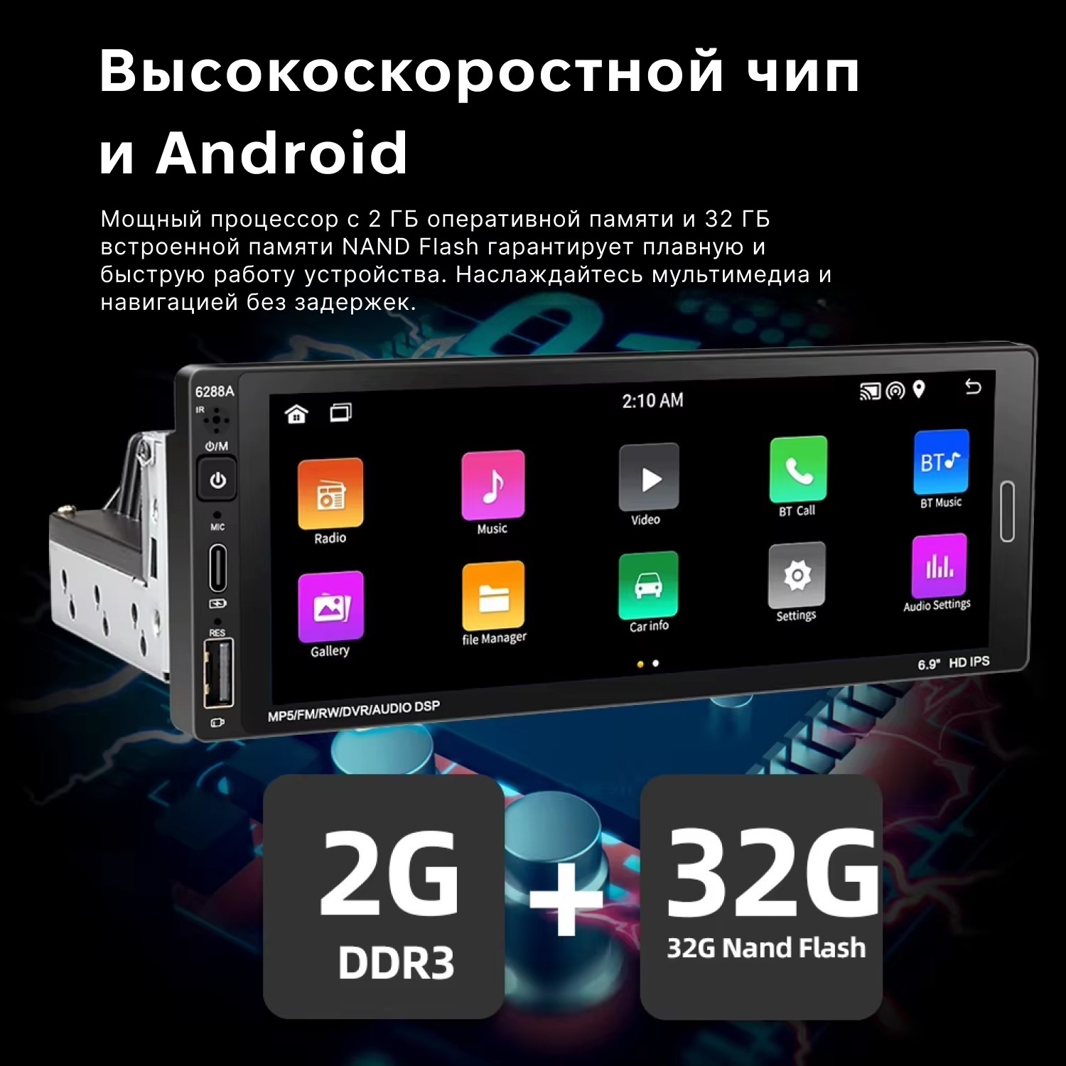 Наличие DSP-эквалайзера для регулировки звука.Автомагнитола сенсорная 1 DIN 6288A с экраном 6,9" и памятью 2/32 ГБ на Android 11 сочетает в себе возможности мультимедийного центра и планшета. На ней можно смотреть фильмы, слушать музыку, просматривать видео на YouTube и скачивать любые приложения из Play Market. Устройство совместимо с широким спектром автомобилей, что делает его отличным выбором для требовательных пользователей, которые активно пользуются интернетом, навигацией и совершают звонки во время вождения.