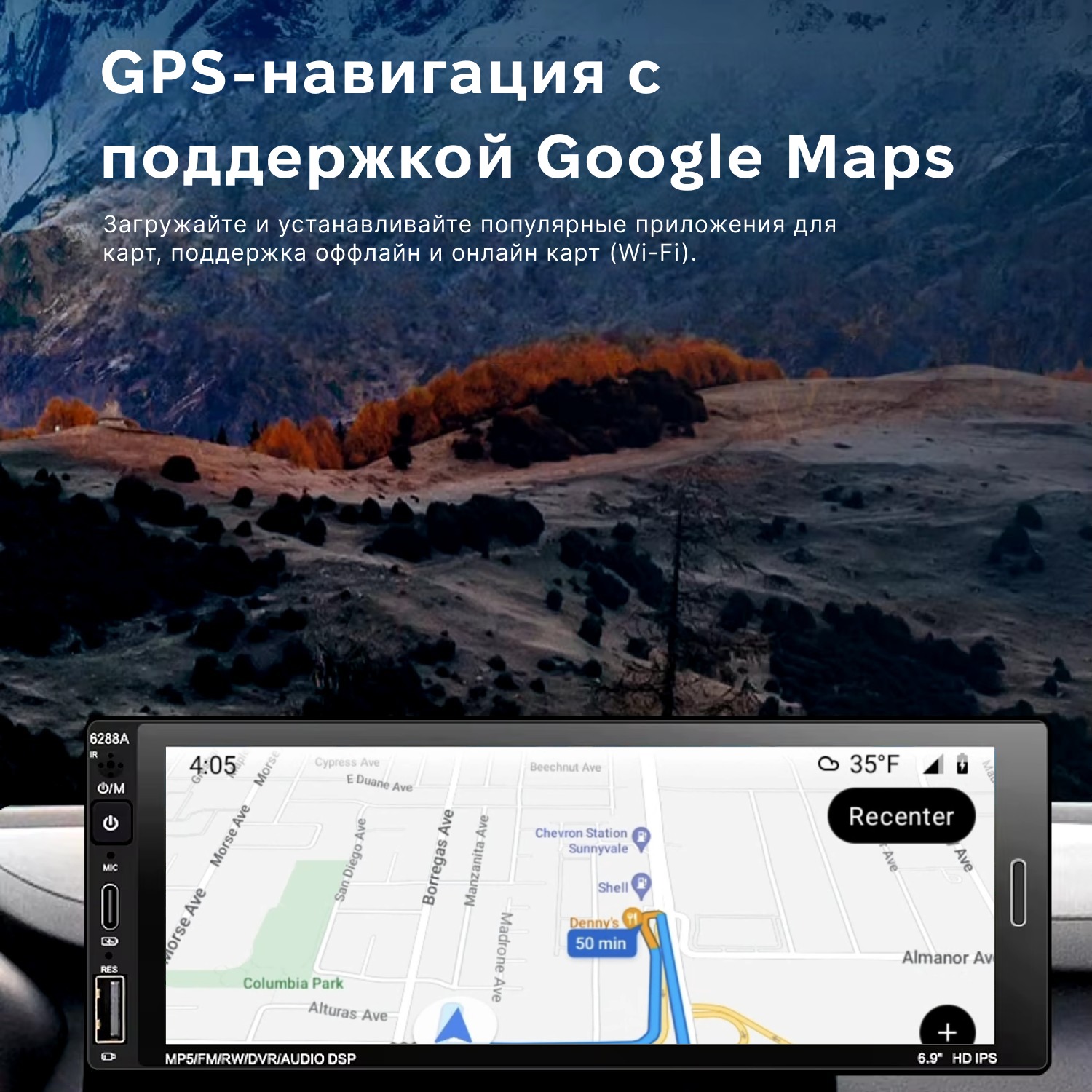 Большой 6,9-дюймовый сенсорный экран с высоким разрешением 1280×480 пикселей.