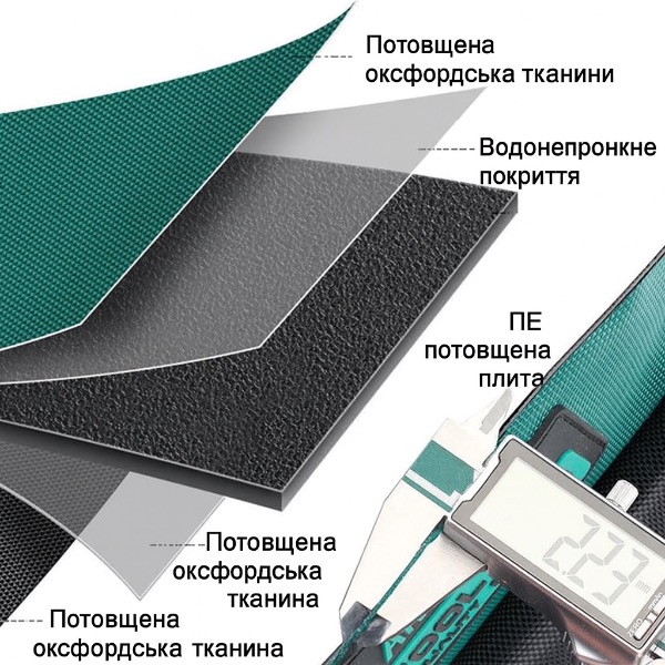 Ця сумка для інструментів виготовлена з високоякісної потовщеної тканини 1680D, яка має вологостійкі властивості, забезпечуючи надійний захист вашого обладнання навіть у складних умовах. Завдяки п'ятишаровій структурі матеріалів сумка стійка до зношування та проколів, що робить її ідеальною для професійного використання.