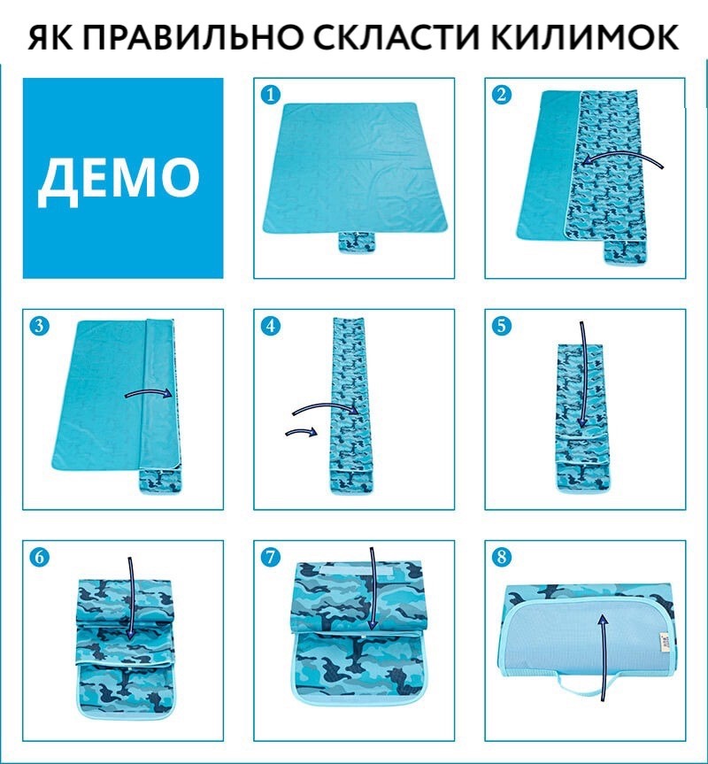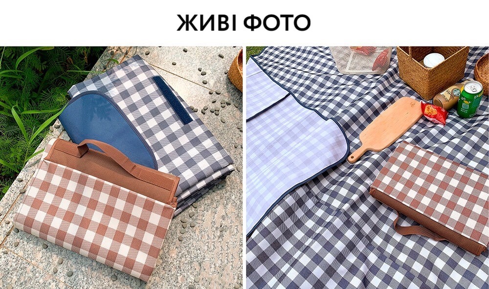 Верх килимка виготовлений з приємної на дотик тканини, низ має додаткову водонепроникну підкладку з ПВХ. Не боїться камінчиків, гострих гілочок, пом'якшує нерівну поверхню, гальку. Зворотний бік виготовлений з водонепроникного матеріалу, що захищає від вологи, холоду та бруду. Покривало може складатися та трансформуватися у зручну сумку з ручкою для перенесення.