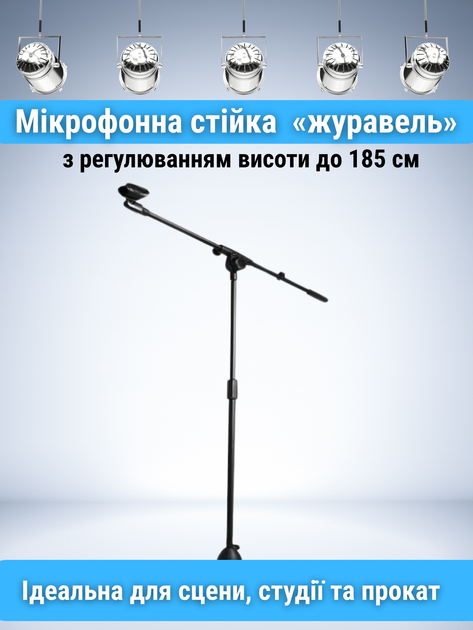 Універсальна мікрофонна стійка типу «журавель» ідеально підходить для сцени, студій та прокатних компаній. Завдяки регульованій конструкції, висоту можна змінювати в межах від 80 до 185 см, а довжина стріли становить 75 см, що дозволяє зручно позиціонувати мікрофон під будь-який сценарій використання.