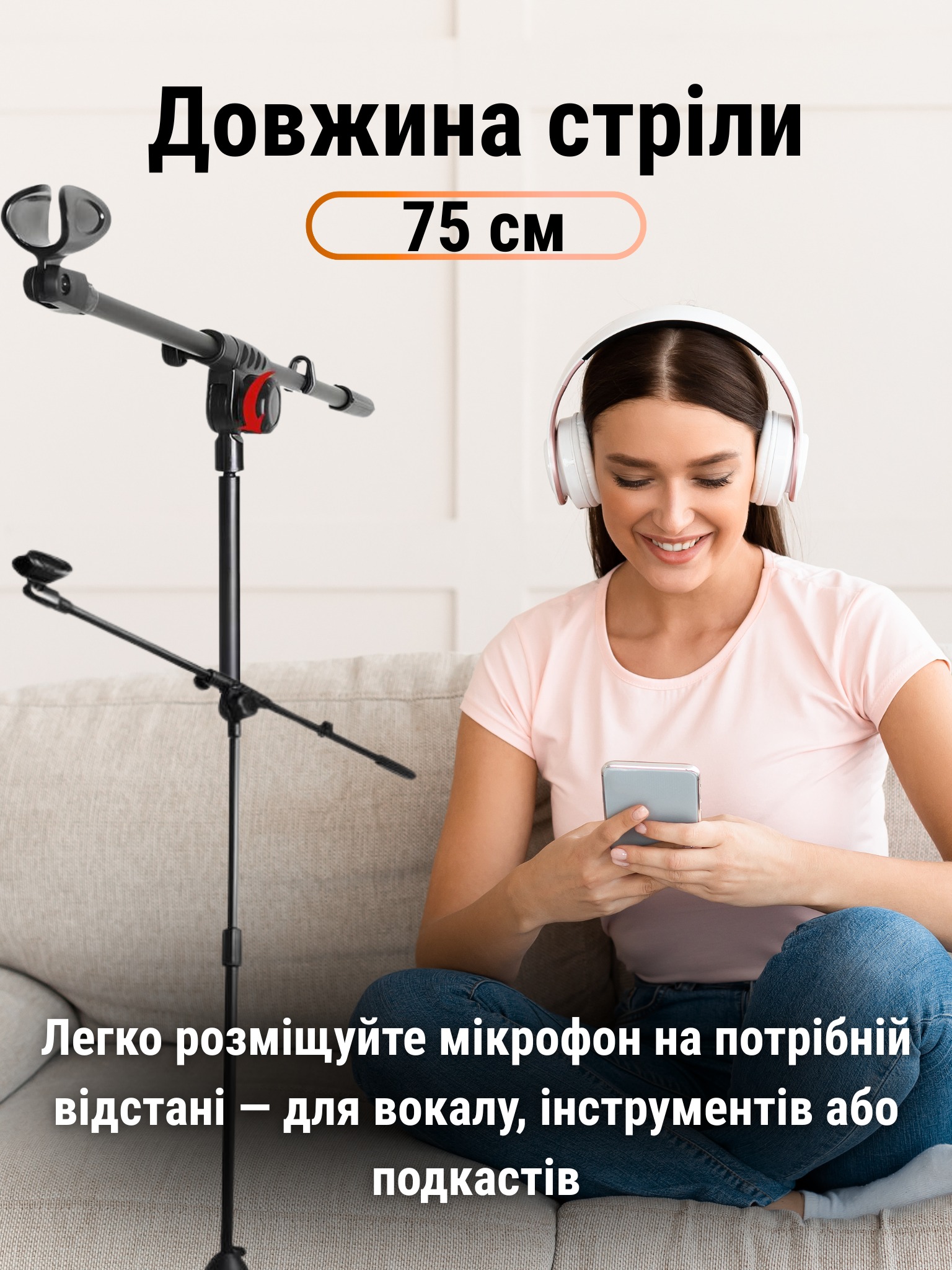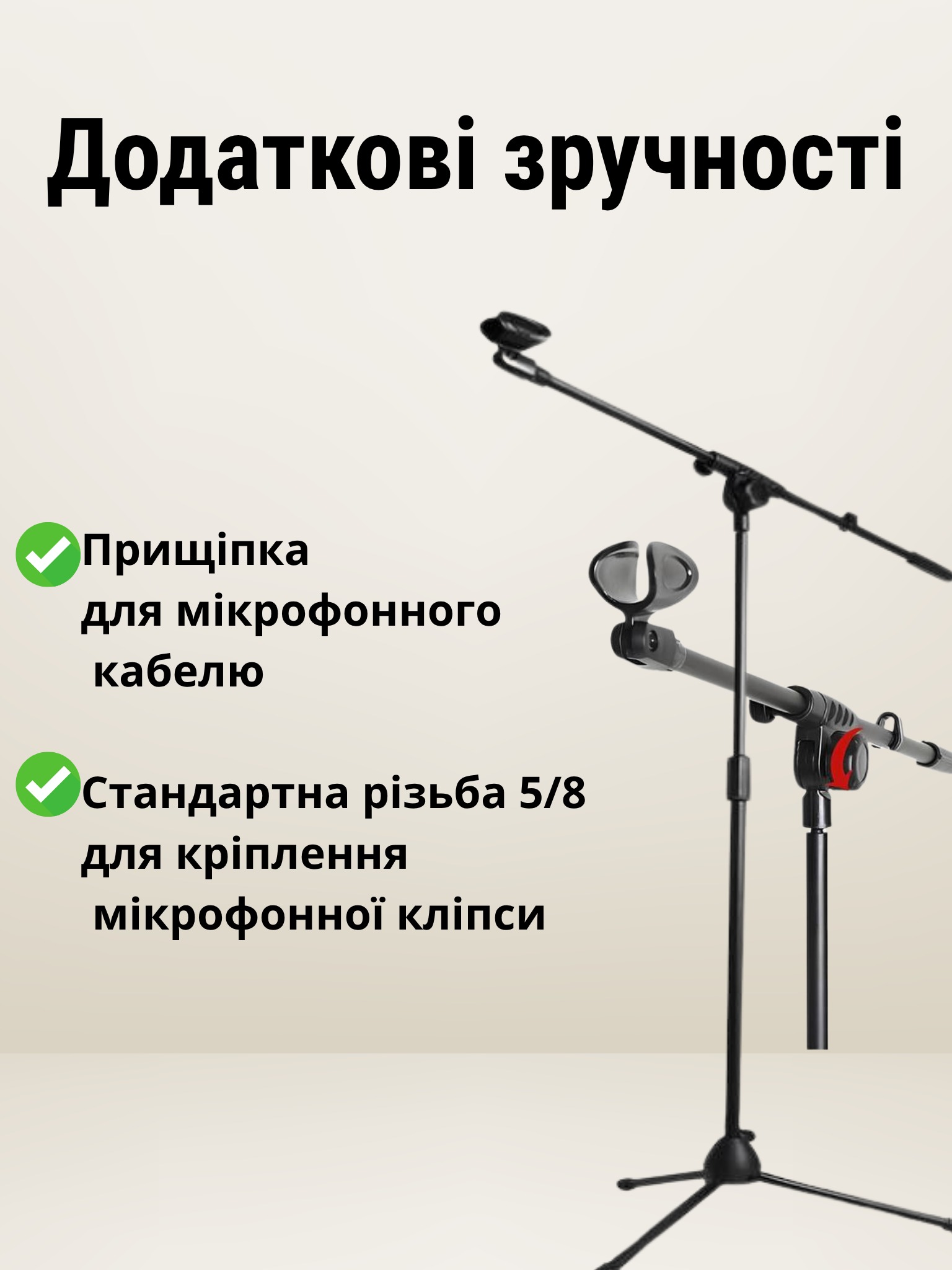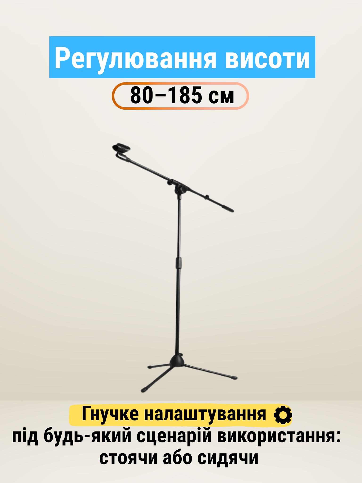 Надійна та зручна мікрофонна стійка типу "Журавель" ідеально підходить для концертів, студійного запису, конференцій та домашнього використання. Завдяки регулюванню висоти та нахилу, ви зможете легко налаштувати положення мікрофона для максимально комфортної роботи.