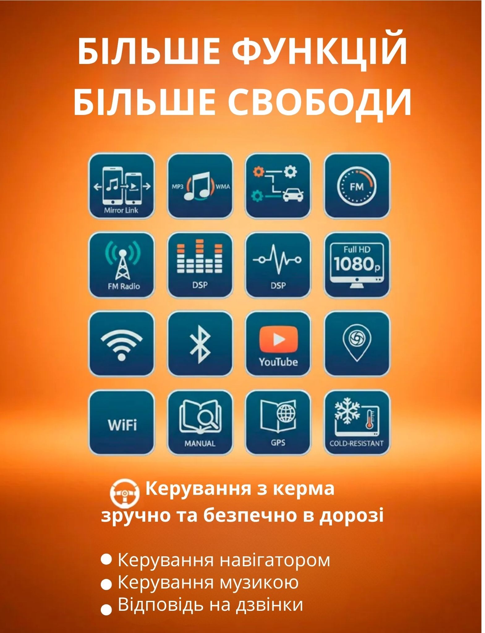 Магнітола легко встановлюється без переробок і підключається до штатних роз’ємів автомобіля. Підтримується підключення камер заднього та переднього виду, а також управління кнопками на кермі.