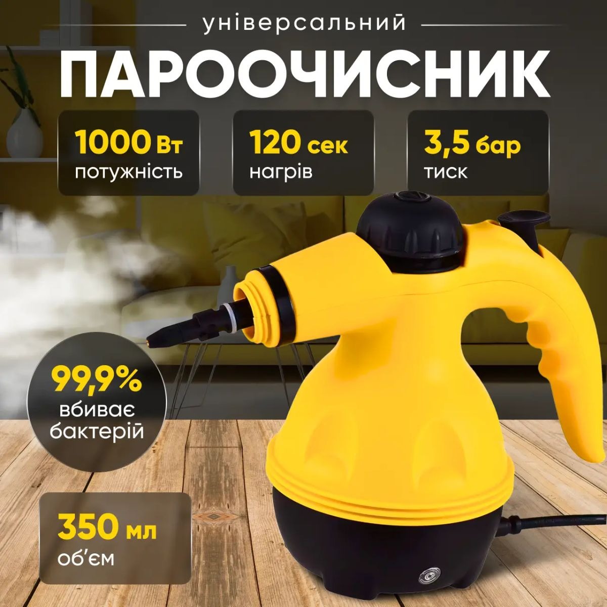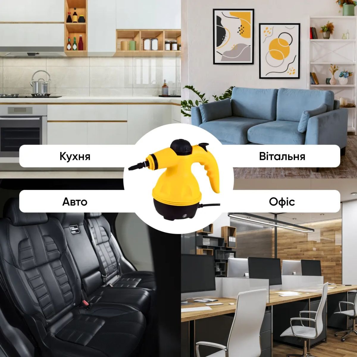 Пароочисник 1000 Вт ручний з 6 насадками, підходить для дому та машини.