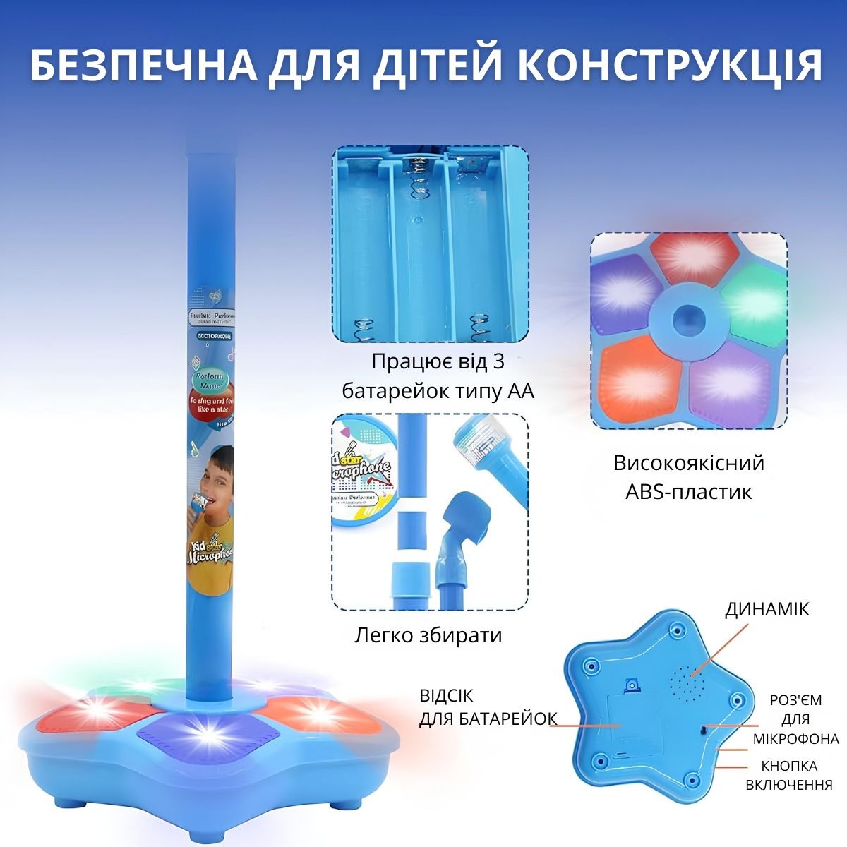 Дитячий мікрофон на стійці «Kid Star Microphone» — це яскрава та захоплива музична іграшка для маленьких співаків та артистів. Мікрофон допоможе дитині відчути себе справжньою зіркою сцени, виконуючи улюблені пісні під музичний супровід і світлові ефекти. Іграшка оснащена регульованою стійкою (до 100 см), що робить її зручною для дітей різного віку. Платформа у формі зірки має яскраву підсвітку, яка створює атмосферу справжнього концерту. Мікрофон можна під’єднати до телефона або MP3-плеєра, щоб співати під улюблені мелодії. Іграшка має міцну конструкцію та стильний дизайн, прикрашений декоративними елементами та наліпками. Керування здійснюється кнопками, розташованими як на мікрофоні, так і на стійці. Працює від 4 батарейок типу AA (не входять до комплекту).