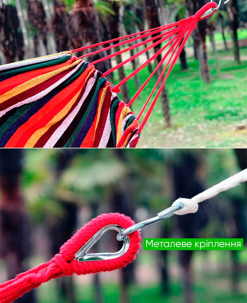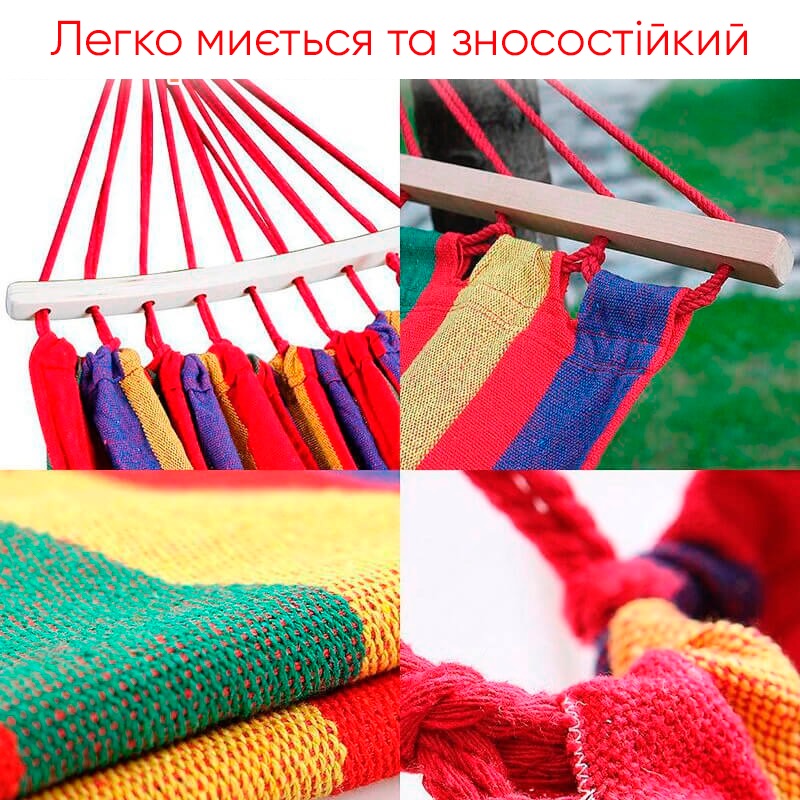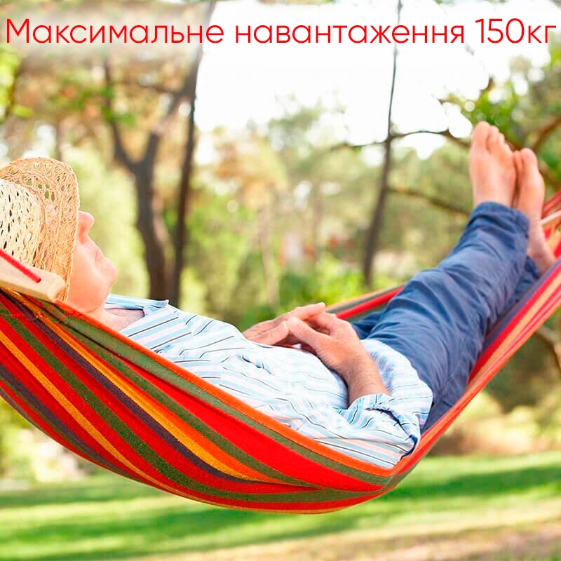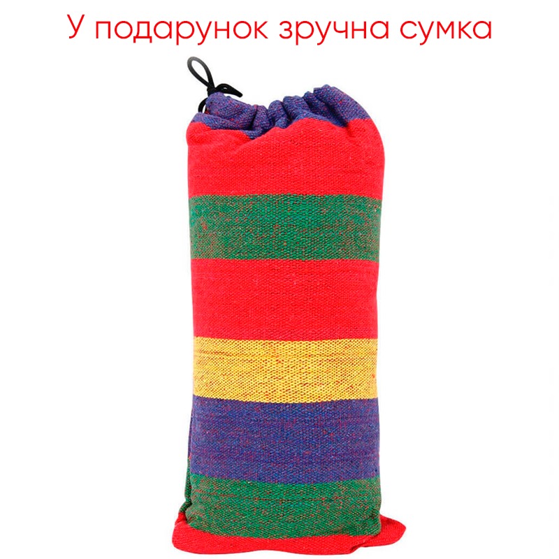 Цей яскравий гамак буде доповнювати красу вашого саду. Відпочинок в гамаку подарує Вам особливе відчуття свободи і невагомості, дозволить розслабитися м'язам спини і шиї, відчути душевний комфорт.Підвісна гамак для відпочинку має в комплекті зручну сумку для транспортування і зберігання. Виготовлений мексиканський гамак з щільної бавовняної тканини, має дуже яскравий смугастий окрас. При фарбуванні використовуються нетоксичні натуральні барвники, які не линяють і не викликають подразнень на шкірі.
