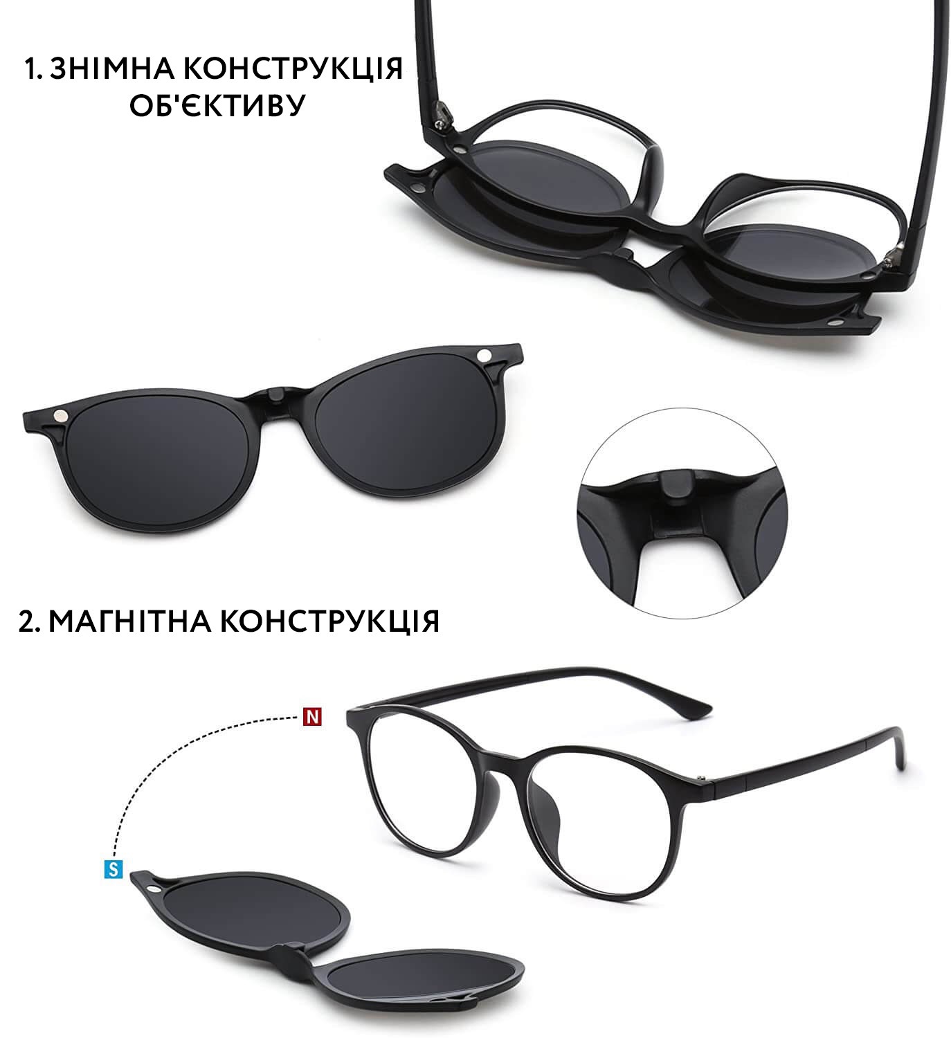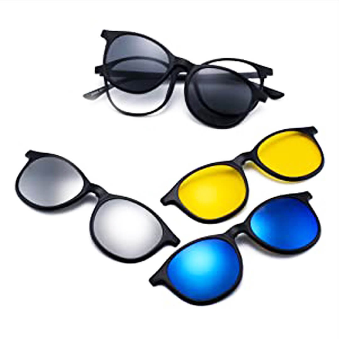 У комплект з прозорими лінзами, входять додаткові лінзи жовтого, синього, сріблястого, прозорого кольору, які кріпляться на окуляри зверху за допомогою потужного магніту.
