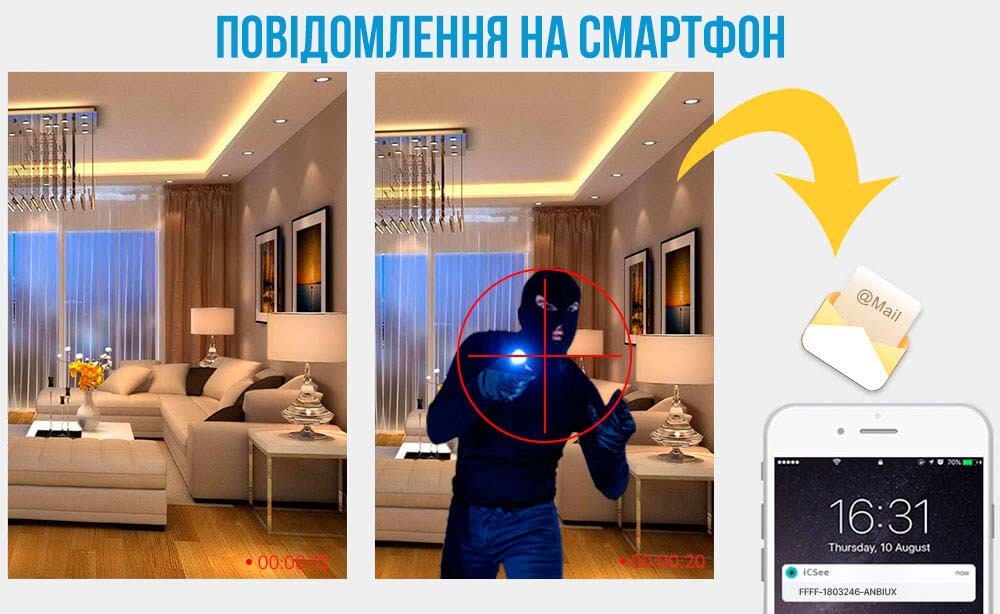 Автоматично перейде у режим нічної зйомки. Навіть у повній темряві камера здатна розрізняти об'єкти та реагувати на них з відстані до 10 метрів.Поворотна мережна IP-камера підключається до мережі за допомогою радіоканалу Wi-Fi. Має функцію повороту. За допомогою аудіозв'язку ви зможете чути все, що відбувається у приміщенні.