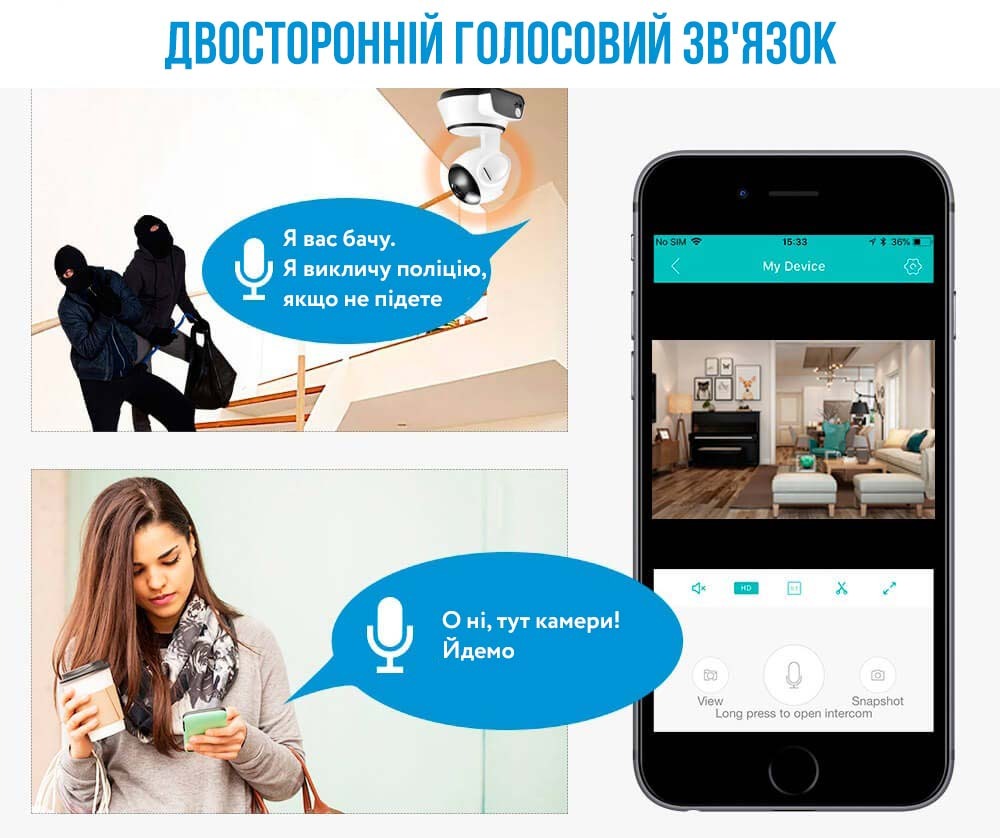 Камери мають систему двостороннього голосового зв'язку. Завдяки цьому ви можете переглядати відео в режимі онлайн зі звуком, а також спілкуватися за допомогою камери та смартфона