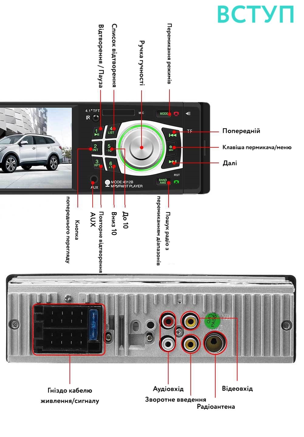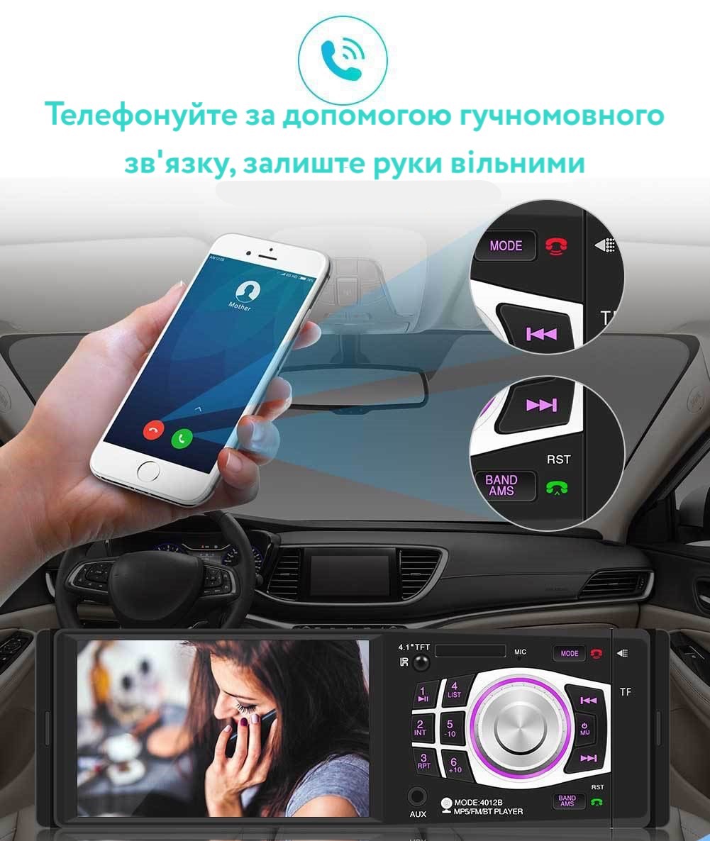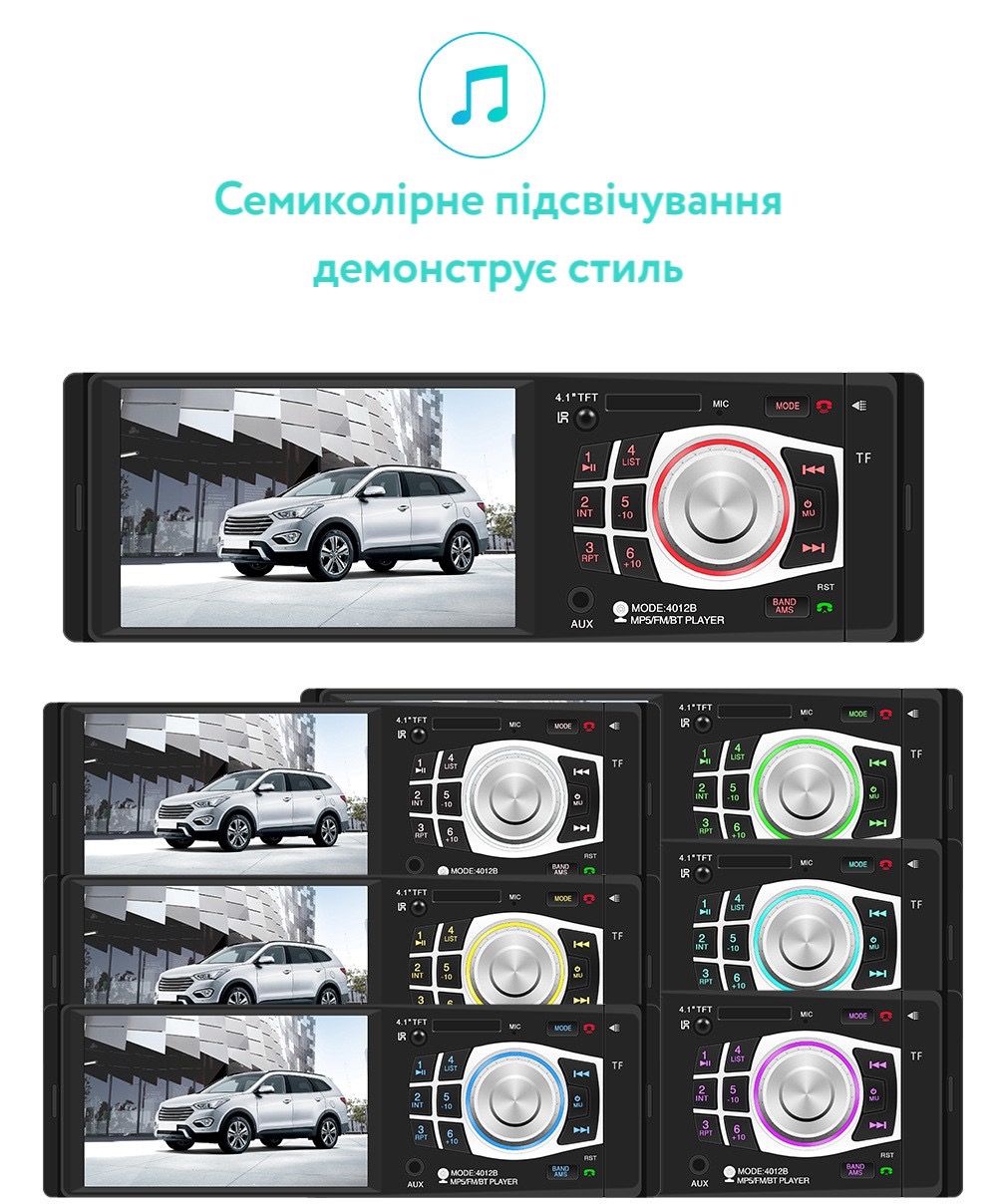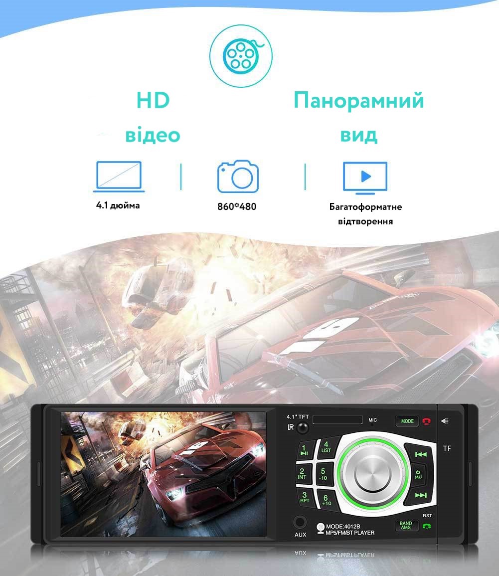 Автомобільна Bluetooth магнітола , з пультом на кермо, 4,1 дюйма екран. MP5, читання всіх популярних форматів медіа файлів. Можливість підключення камери заднього виду. Підсвічування магнітоли працює в режимі RGB, так що тепер Ви можете зробити налаштування кольору на ваш смак. Данная магнитола относится к классу МП5 монитор с экраном более 4" с возможностью воспроизведения не только музыки в формате МР3, но и видео файлов различных форматов. Также большим преимуществом является наличие беспроводного интерфейса BLUETOOTH, с помощью которого можно подключать Ваш телефон и слушать музыку с него, отвечать на звонки, при этом не держа телефон руками. В данной модели добавили видео выход под внешний монитор, на который можно вывести фильм в FULL HD качестве, а также тут есть вход под камеру заднего вида, что значительно упростит парковку вашего авто.