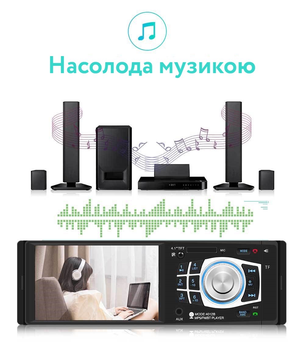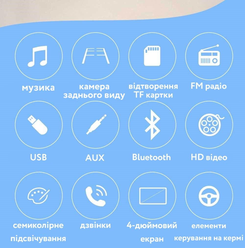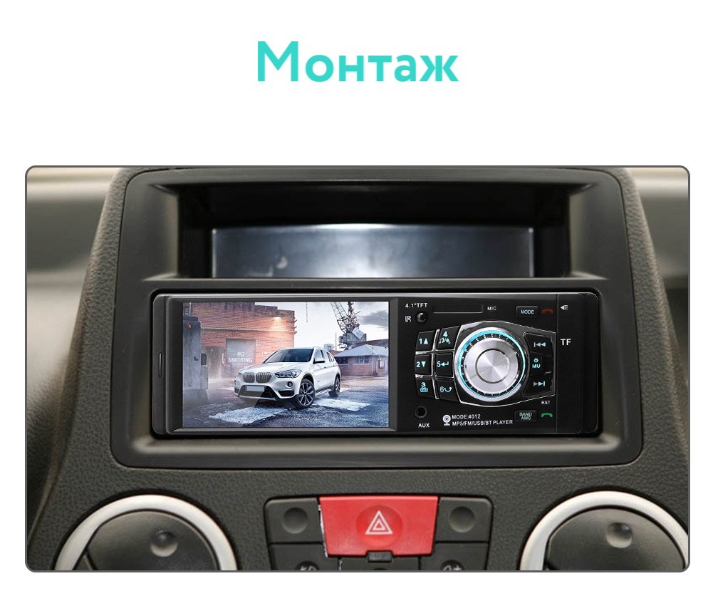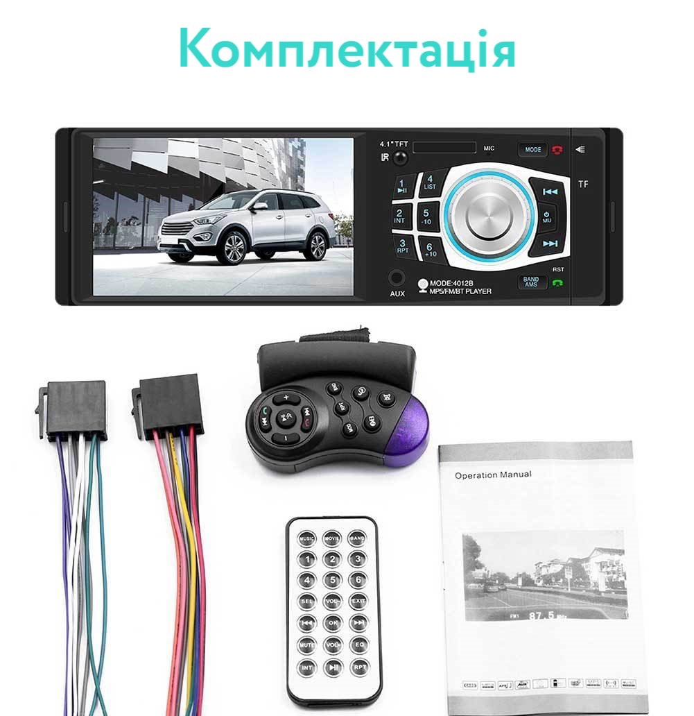 Автомобільна Bluetooth магнітола , з пультом на кермо, 4,1 дюйма екран. MP5, читання всіх популярних форматів медіа файлів. Можливість підключення камери заднього виду. Підсвічування магнітоли працює в режимі RGB, так що тепер Ви можете зробити налаштування кольору на ваш смак. Данная магнитола относится к классу МП5 монитор с экраном более 4" с возможностью воспроизведения не только музыки в формате МР3, но и видео файлов различных форматов. Также большим преимуществом является наличие беспроводного интерфейса BLUETOOTH, с помощью которого можно подключать Ваш телефон и слушать музыку с него, отвечать на звонки, при этом не держа телефон руками. В данной модели добавили видео выход под внешний монитор, на который можно вывести фильм в FULL HD качестве, а также тут есть вход под камеру заднего вида, что значительно упростит парковку вашего авто.