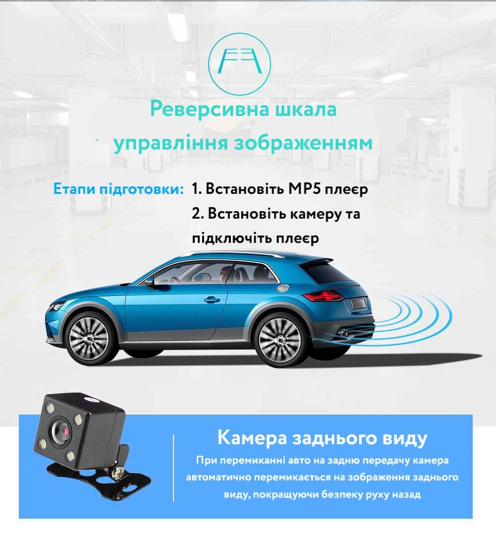 Для безпечного паркування передбачено відео вхід. Він дозволяє підключити камеру заднього виду. При включенні задньої передачі надходить сигнал і вмикає відео з камери. Завдяки цьому є можливість зберегти крихкий бампер та фарбу.Характеристики: