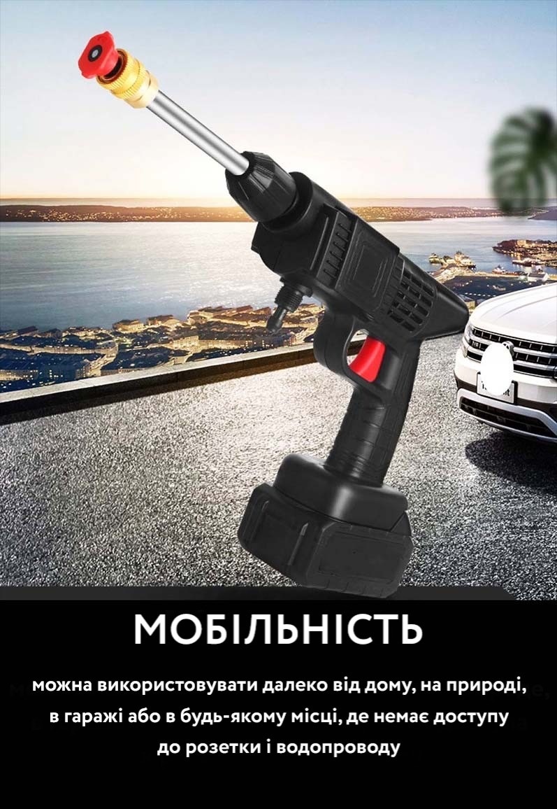 Портативність і мобільність: Завдяки компактним розмірам і тому, що немає потреби під'єднати до електромережі, ця мінімийка забезпечує свободу переміщення та використання в будь-якому місці, де потрібна мийка.