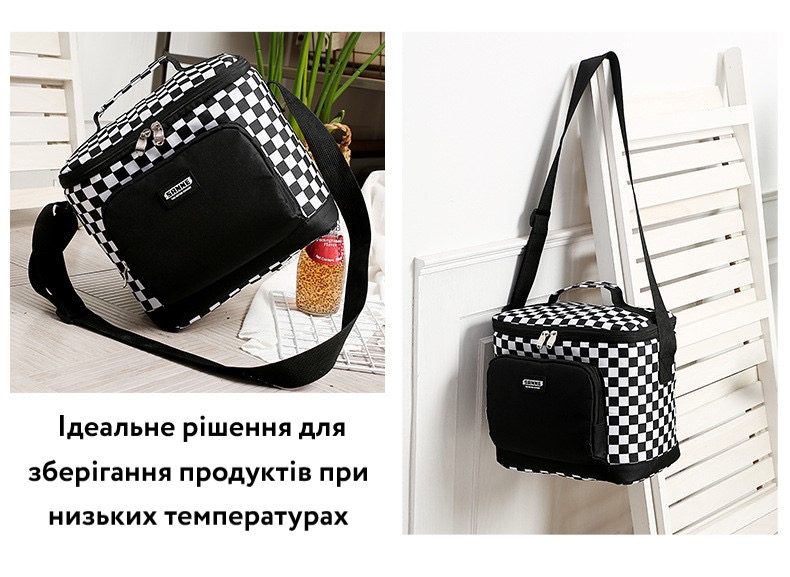 Вага 400 г Висота 30 см Ширіна 21 см Довжина 21 см Підтримка температури за допомогою акумуляторів. холоду 12 годин Кишеньки для аксесуарів Є Матеріал 600 D поліестер Підкладка Алюмінієвий термопласт Принт Шаховий Режим роботи Холод/тепло