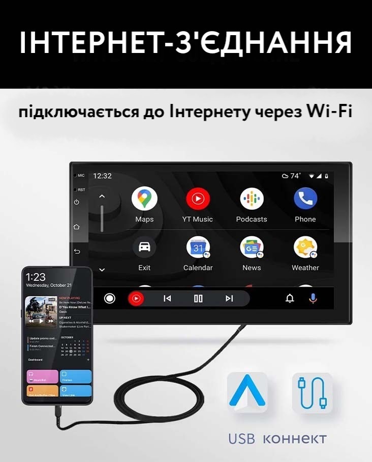 | Найменування товару | Автомагнітола з радіо FM, стерео, USB/MMC/SD, музика/відео, еквалайзер, AUX вхід, LCD дисплей з підсвіткою, можливість підключення задньої камери, GPS навігація, Android, WI-FI |