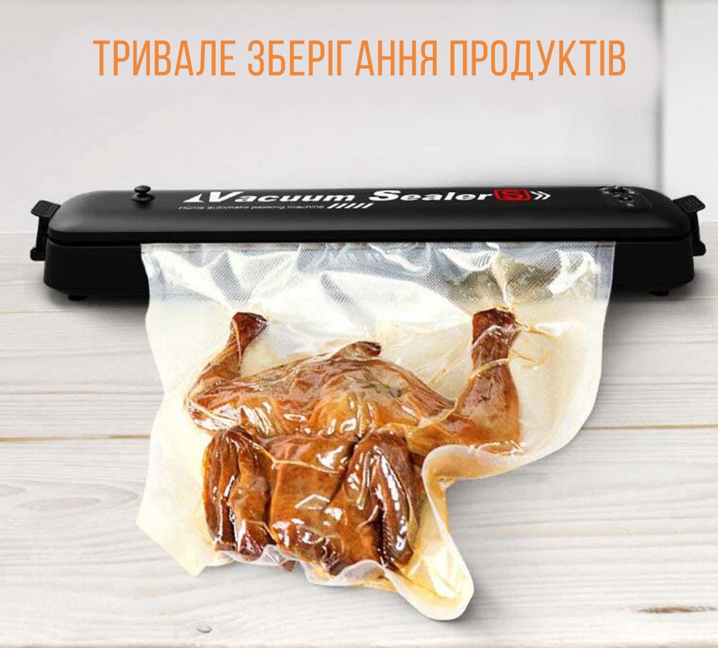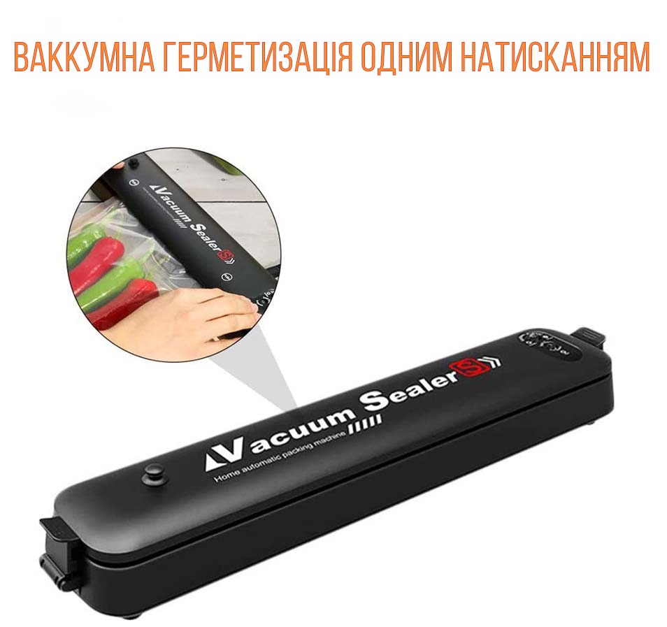 Вакуумна герметизація одним натисканнямВакуумний пакувальник – найкраще рішення для зберігання продуктів у морозильних та холодильних камерах. Вакуумна упаковка зберігає їжу свіжою протягом тривалого часу, захищає продукти від бактерій, надлишку вологи, плісняви та обмороження.