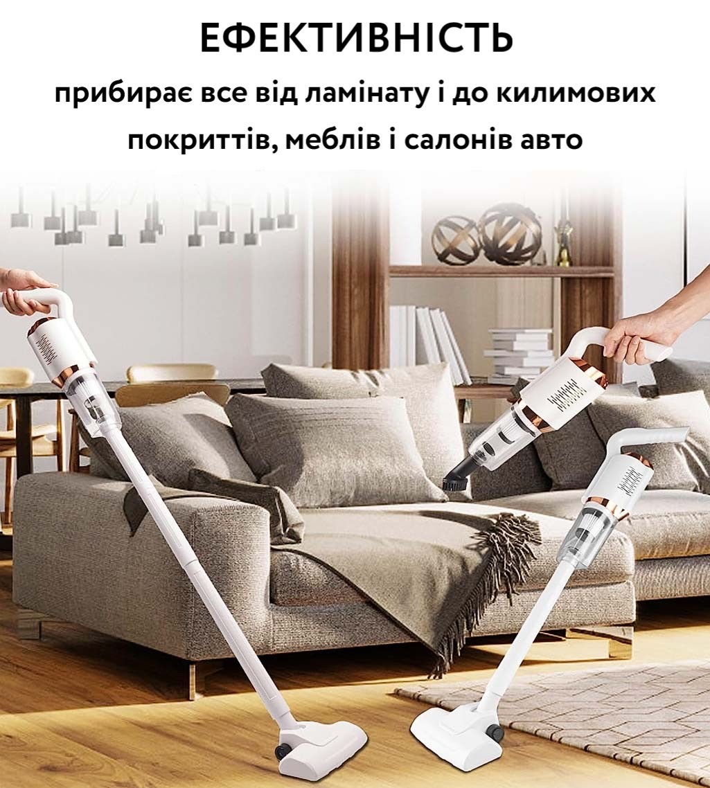 Багатофункціональність: Висувайте ручку і прибирайте підлогу або килимові поверхні, не нагинаючись і не докладаючи великих зусиль. Щоб очистити кухонні поверхні, меблі, текстиль чи полиці, скорочуйте ручку, встановлюйте спеціальну насадку та можете братися.