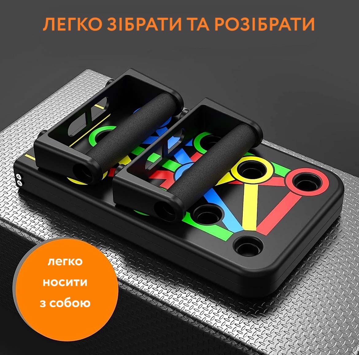 Дошка для віджимань з кольоровою розміткою допоможе максимально ефективно формувати та зміцнювати верхню частину тіла, адже у вас з'явиться можливість змінювати положення тіла та кут нахилу.