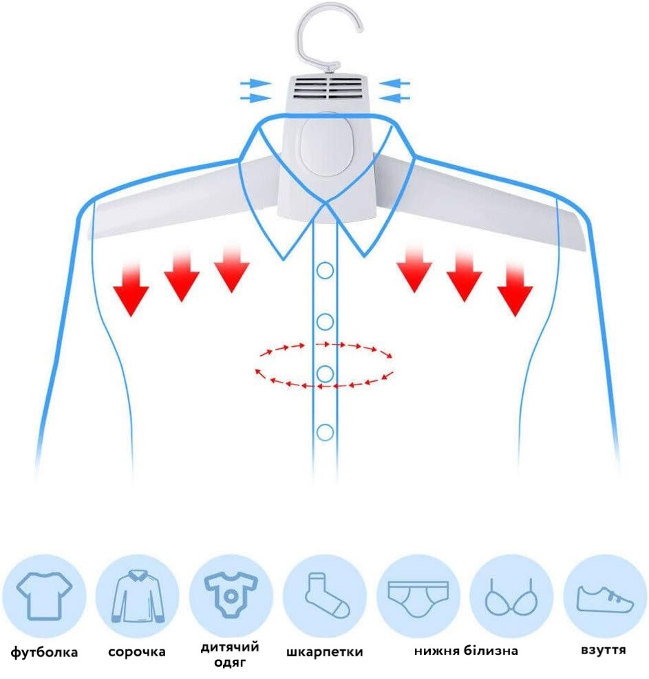 Електрична підвісна сушарка для одягу являє собою звичайну вішалку. Але повісьте на неї мокру річ, увімкніть у розетку – і перед вами портативна сушарка. До прикладу, футболка або рубашка буде готова до використання вже через 60-90 хвилин після того, як ви достанете її з пральної машини. Пристрій створює потік теплого повітря, який забезпечує швидке сушіння тканини. Висока теплоефективність, заощадження великого обсягу енергії!