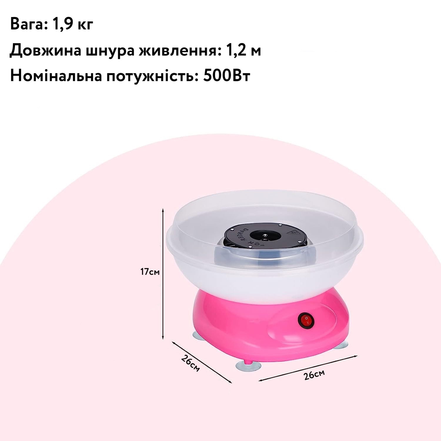 Апарат простий у використанні та приготуванні досить захоплююче заняття. Можна під наглядом дорослих дозволити приготувати солодку вату навіть дитині. Подивитися за тим, як утворюються тонкі цукрові волокна і потім вони перетворюються на пухнасту солодку хмару, яку відразу можна з'їсти.Характеристики: