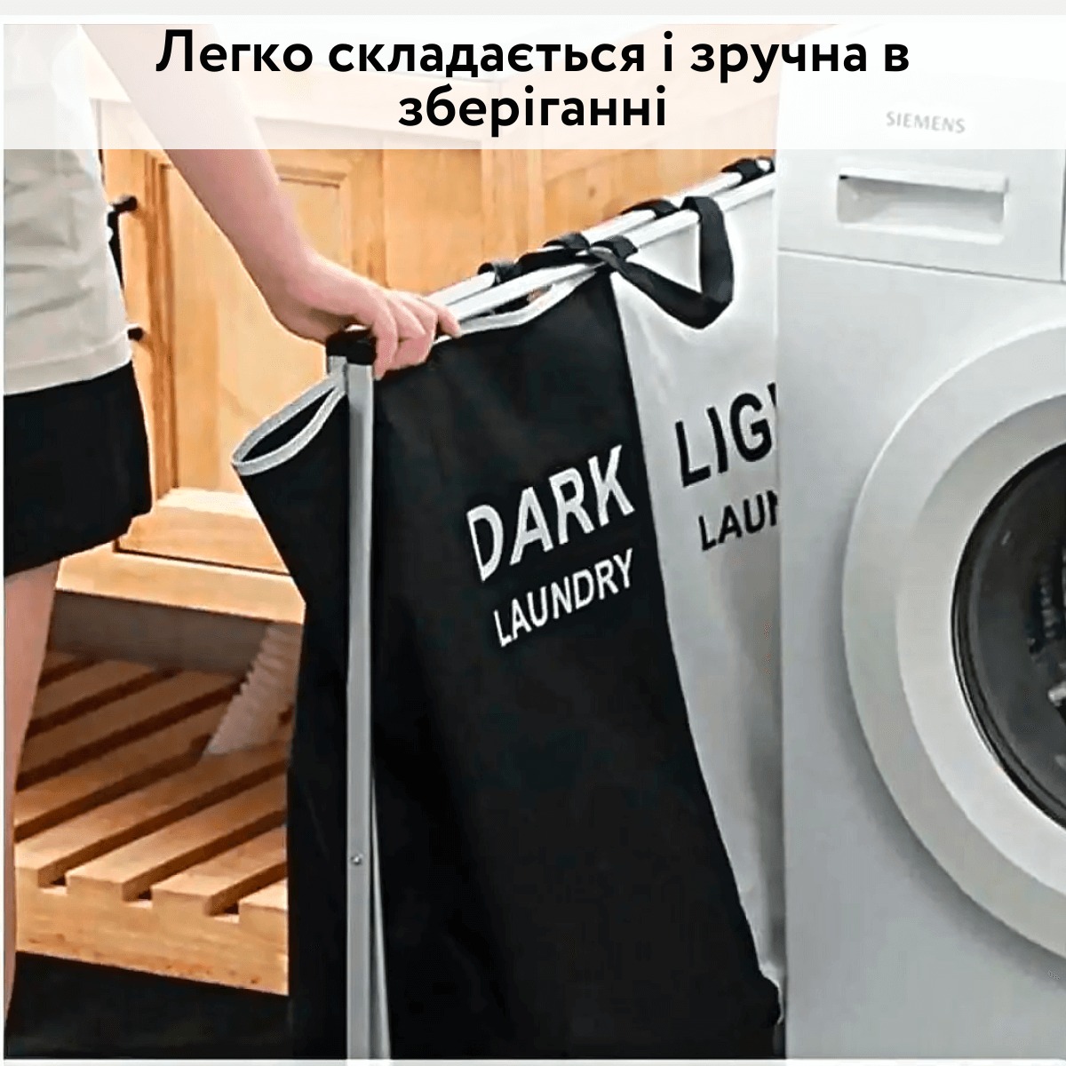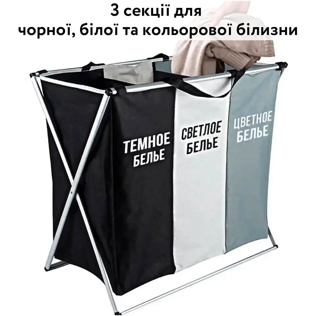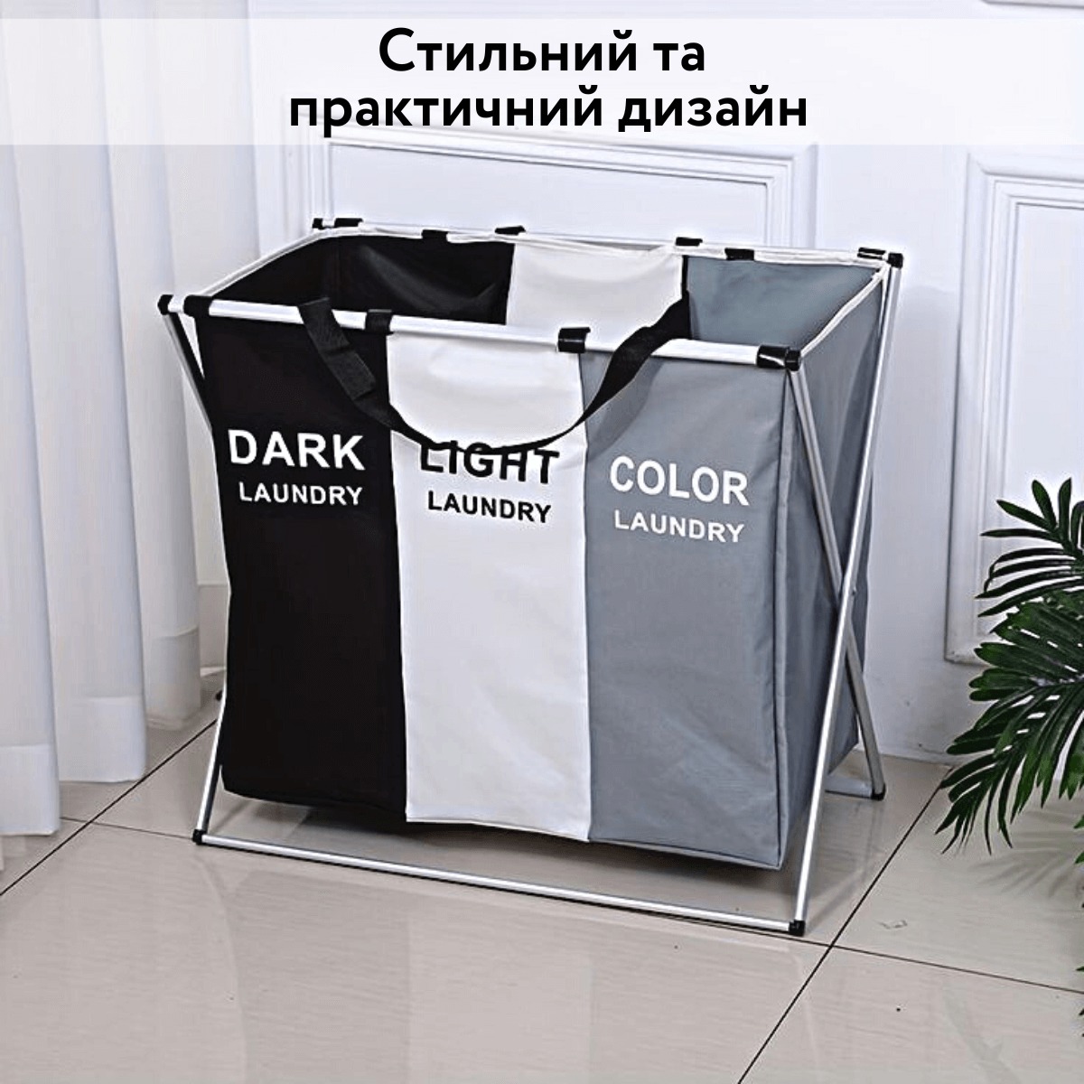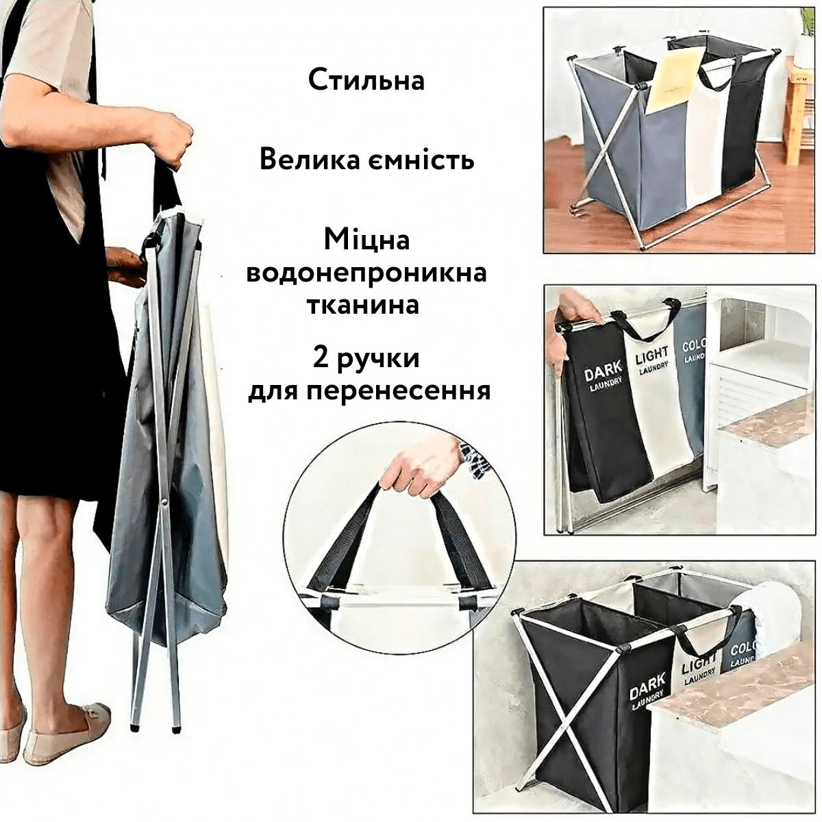 Кошик для білизни з трьома секціями - місткий, мобільний, складний, легкий і міцний. Кошик розроблений для попереднього сортування білизни перед пранням на чорну, білу та кольорову.