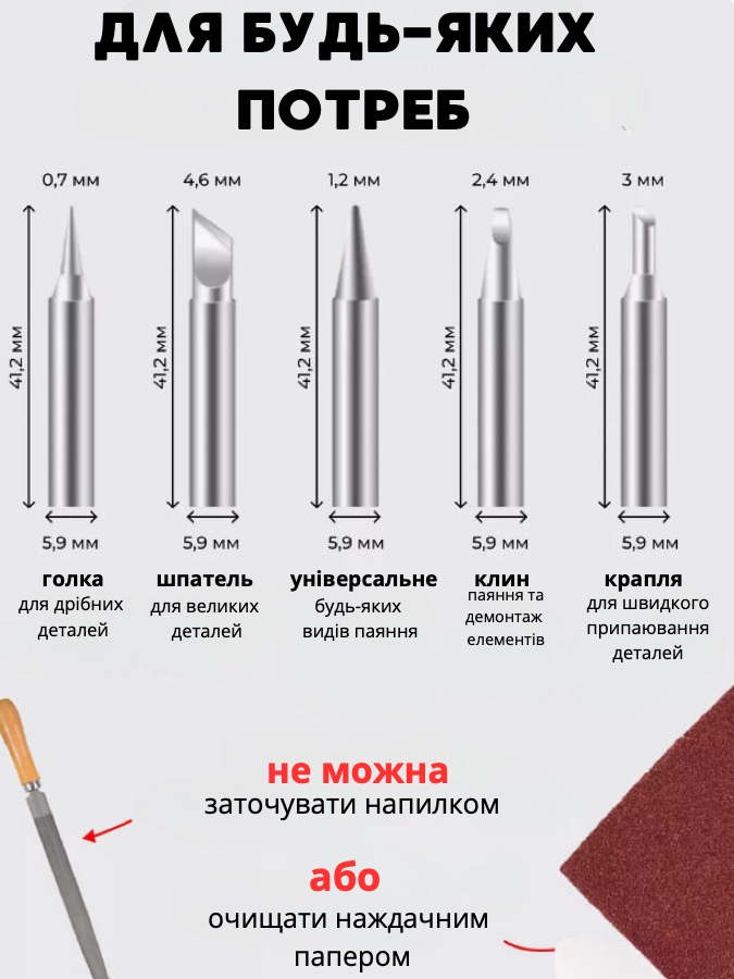 - 5 змінних жал різної форми та розміру для різних завдань пайки.